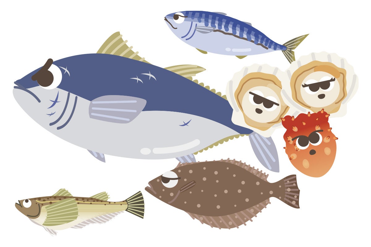 大間マグロに金華サバなど、海産物の宝庫の東北をイラスト化。ポストカードでは「東北コットンCoC」というサステナブル紙を使用することで地域貢献も目指しています