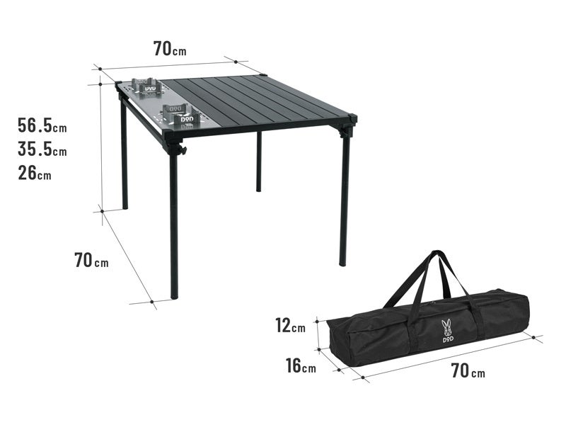 製品名:チュウキチテーブル 型番・カラー:TB2-108-BK・ブラック 販売価格:19,800円(税、送料込) サイズ:(約)W70×D70×H26/35.5/56.5cm 収納サイズ:(約)W70×D16×H12cm 総重量:(約)4.9kg 材質:<フレーム、天板>アルミ合金、スチール <バーナープレート>ステンレススチール <キャリーバッグ>ポリエステル 静止耐荷重:<全体>30kg、<バーナープレート>10kg セット内容:天板、メインフレーム×2、サイドフレーム×2、バーナープレート、風防A×4、風防B×4、Iプレート×2、ガス缶ホルダーA×2、ガス缶ホルダーB×2、タイベルト×2、レッグ(長)×4、レッグ(短)×4、レッグキャップ×4、バーナーパーツ用バッグ、キャリーバッグ |