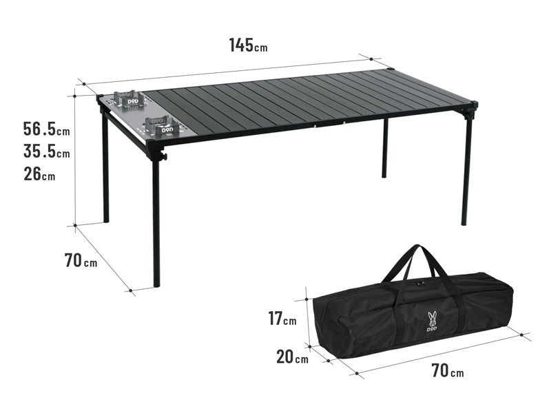 製品名:ダイキチテーブル 型番・カラー:TB6-107-BK・ブラック 販売価格:29,700円(税、送料込) サイズ:(約)W145×D70×H26/35.5/56.5cm 収納サイズ:(約)W70×D20×H17cm 総重量:(約)7.5kg 材質:<フレーム、天板>アルミ合金、スチール <バーナープレート>ステンレススチール <キャリーバッグ>ポリエステル 静止耐荷重:<全体>30kg、<バーナープレート>10kg セット内容:天板×2、メインフレーム×2、サイドフレーム×2、バーナープレート、風防A×4、風防B×4、Iプレート×2、ガス缶ホルダーA×2、ガス缶ホルダーB×2、タイベルト×2、レッグ(長)×4、レッグ(短)×4、レッグキャップ×4、バーナーパーツ用バッグ、キャリーバッグ |