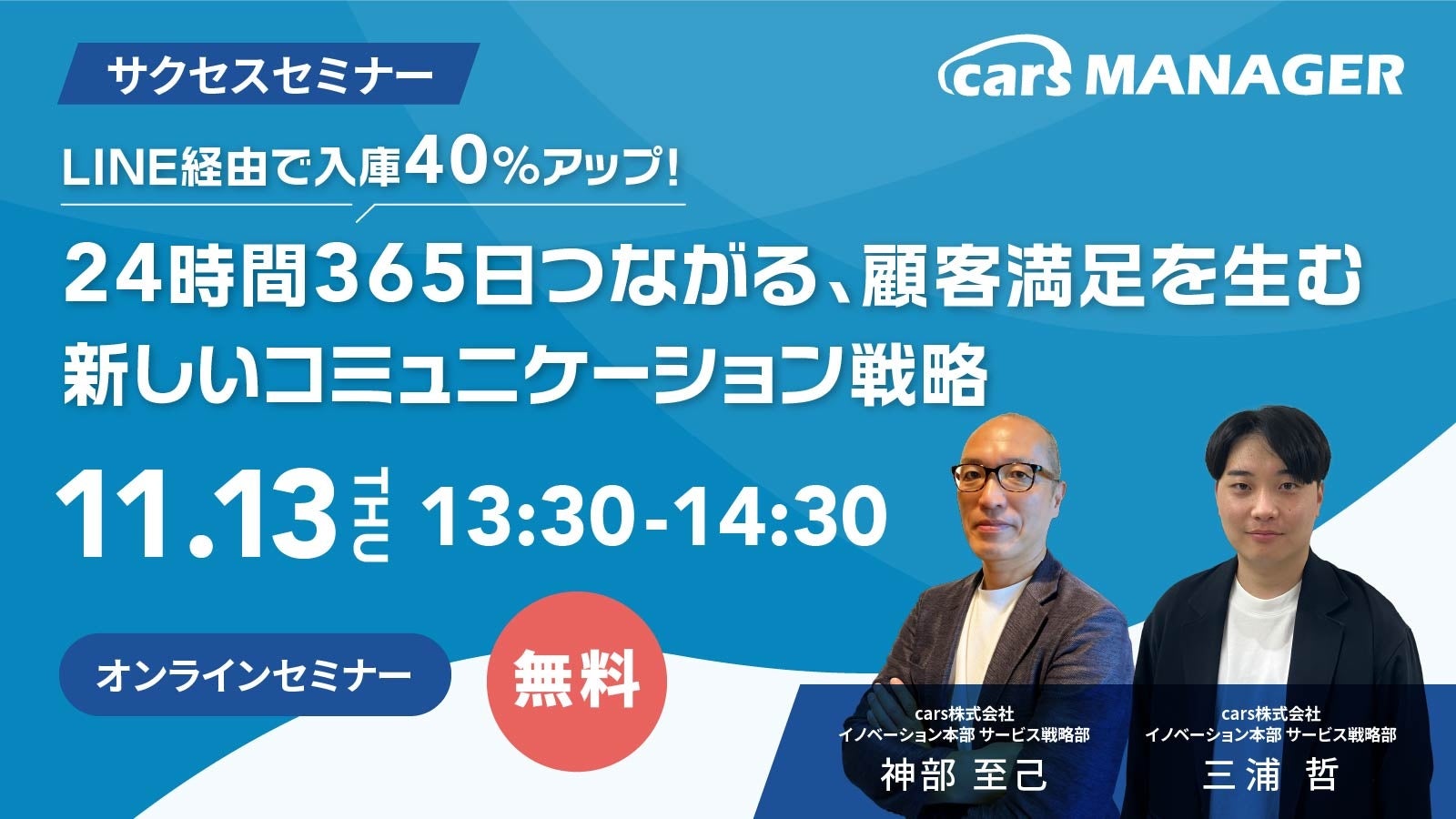 cars株式会社では、LINEを活用して24時間365日お客様とつながり、入庫率を40%アップさせた実践ノウハウを公開する【サクセスセミナー】を開催します。