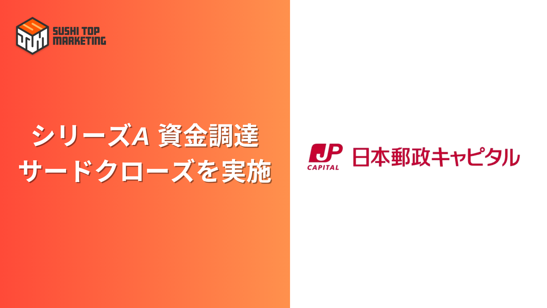 SUSHI TOP MARKETING株式会社(本社:東京都千代田区、代表取締役:徳永大輔、以下 SUSHI TOP MARKETING)は、日本郵政キャピタル株式会社(本社:東京都千代田区、代表取締役社長:足立 崇彰)を引受先とするシリーズA 3rdラウンドにおいて、1億円の資金調達を実施しました。