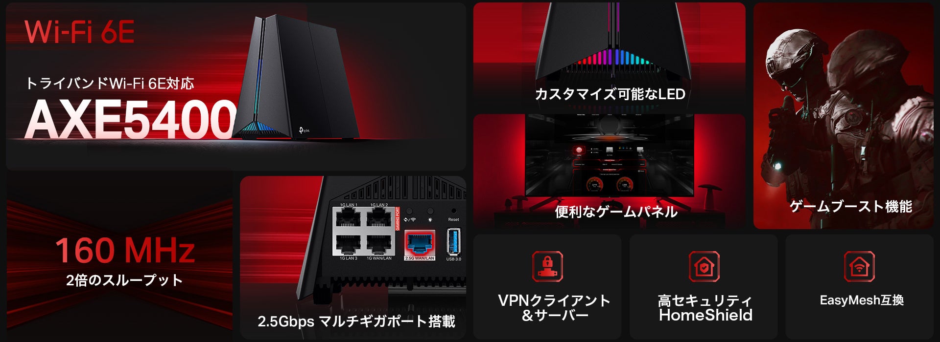 2402Mbps (6GHz) + 2402Mbps (5GHz) + 574Mbps (2.4GHz) のトライバンドWi-Fi、6GHzバンドによるWi-Fi 6E デバイス専用のチャンネルで、混雑を回避してゲームをお楽しみいただけます。*1*2 超高速2.5Gbps WAN/LANポート×1 + 1Gbps WAN/LANポート×1 + 1Gbps LANポート×3のマルチギガポートを搭載しているので、マルチプレイでもライバルに後れを取る心配がなくなります。*3 ゲームブースト機能により、ゲームアプリ・ゲーム機・モバイルゲーム・ゲームサーバーをブーストして、ジッター・ラグ・Pingを最小化。超低遅延で安定したゲーム体験をお届けします。シンプルで使いやすいゲーム管理パネルで、リアルタイムのインサイトデータ取得や各種設定が可能です。TP-Link HomeShieldにより強力なウィルス対策機能でデバイスや個人情報をしっかりと保護。セキュリティリスクを気にせず、ゲームの世界に没入できます。*4 EasyMeshに互換性があるため、EasyMesh対応ルーターや中継器と組み合わせて、お家全体をカバーする広範囲なメッシュWi-Fiを構築すれば、快適なオンライン体験が可能です。*5