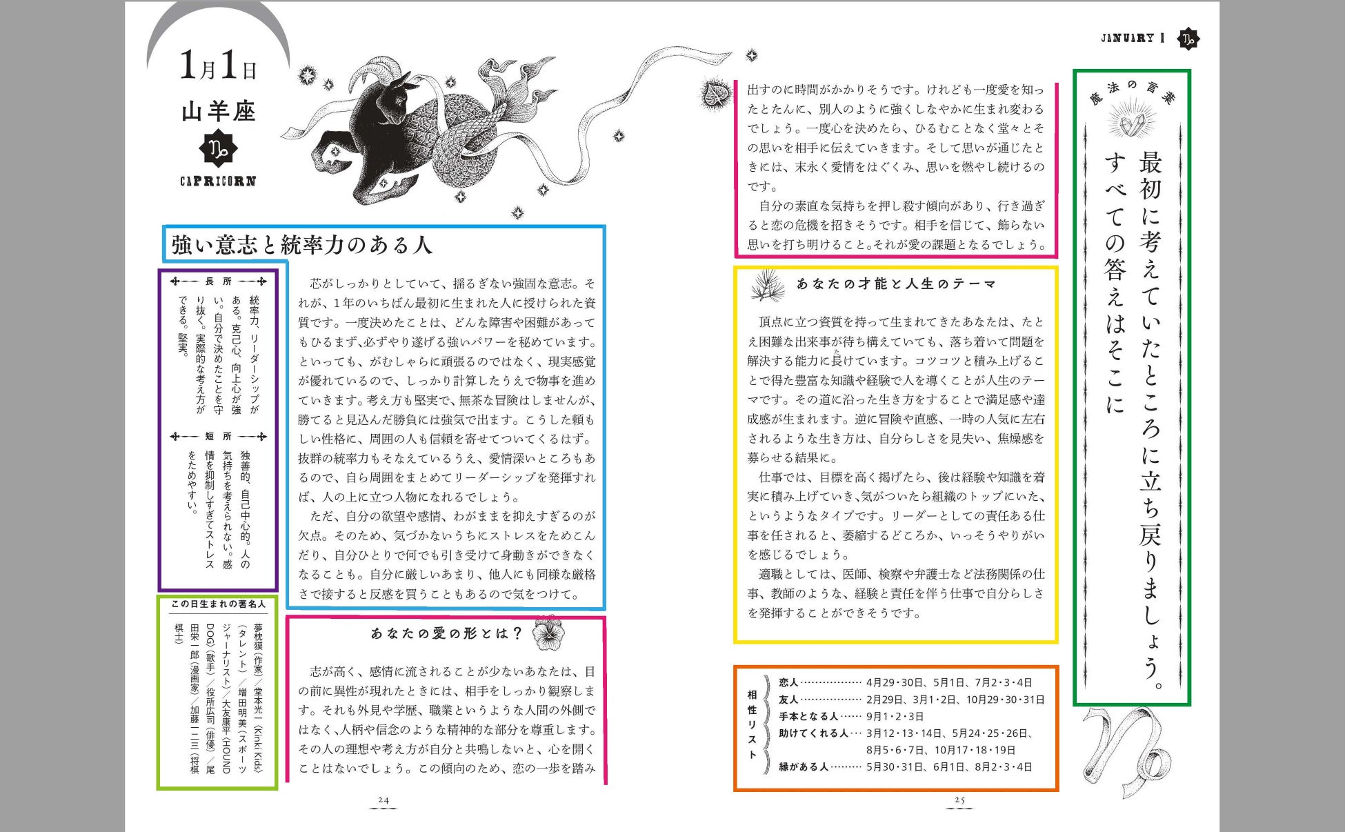 本書は誕生日占いの他に、鏡リュウジ書き下ろし366日の「魔法の言葉」を収録し、「書物占い」として毎日楽しめる仕様です。