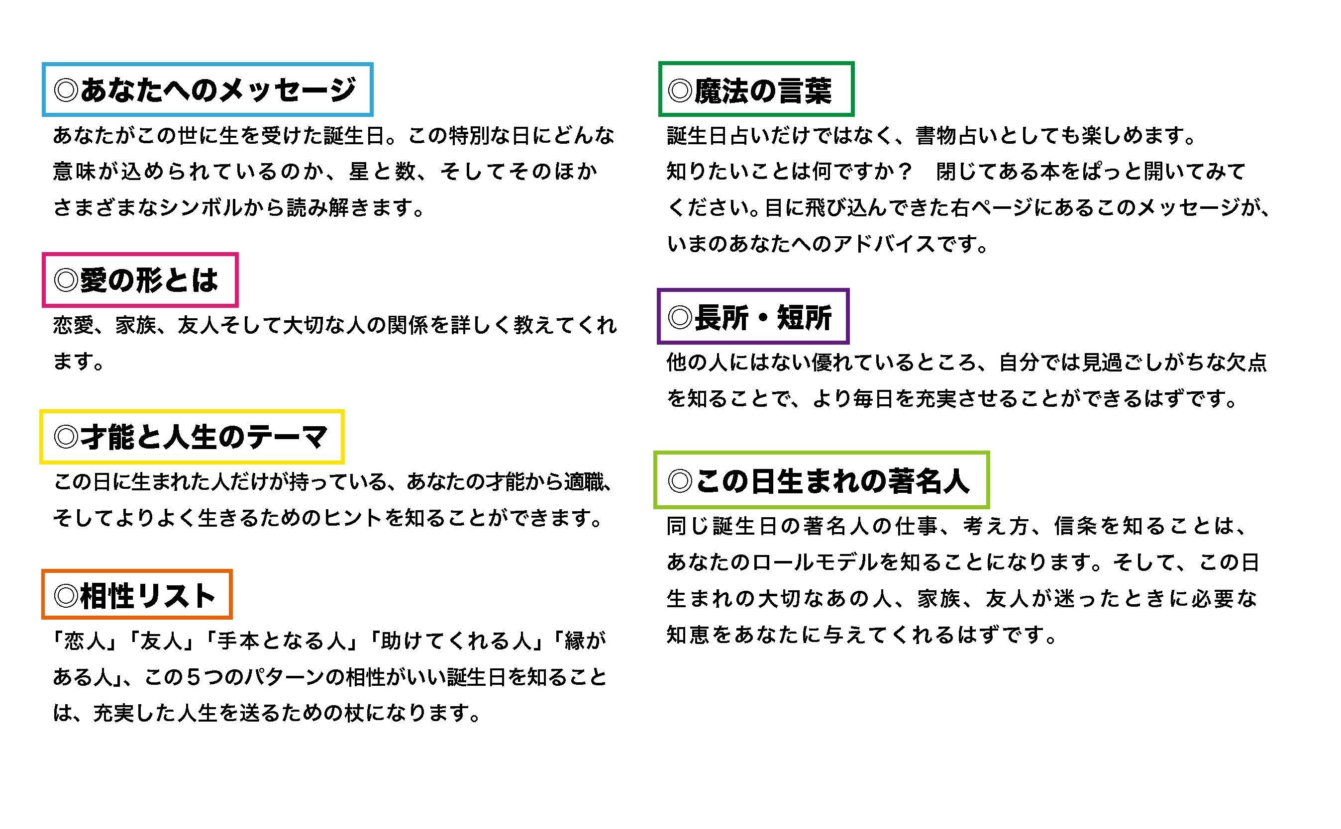 - 緑:【魔法の言葉】。誕生日占いだけではなく、書物占いとしても楽しめます。知りたいことは何ですか? 閉じてある本をぱっと開いてみてください。目に飛び込んできた右ページにあるこのメッセージが、今のあなたへのアドバイスです。