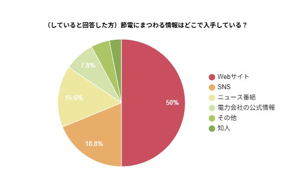 節電情報の入手先としては「Webサイト」(50%)が圧倒的に多く、次いで「SNS」(18.8%)、「ニュース番組」(15.6%)と続きました。一方で、「電力会社の公式情報」(7.8%)は少数にとどまっており、信頼性の高い情報であっても十分に活用されていない実態が見えてきました。