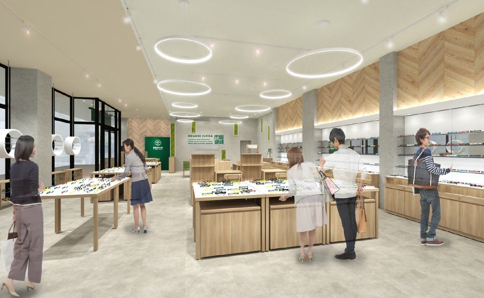 新設された増床棟につながる交差点に位置する同店は、通路に面した壁がガラス張りで、明るく開放感があり、入店しやすい店舗です。店内は、メガネのレンズをモチーフにした円形の照明や什器を取り入れた都会的なデザイン。グリーンの植栽パネルと明るい木目調の落ち着いたデザインが組み合わさることで居心地の良い空間を演出しています。