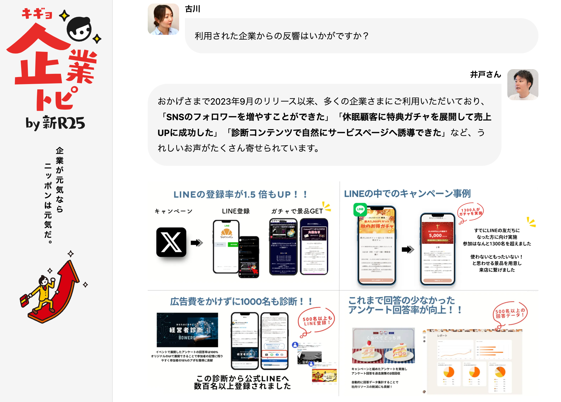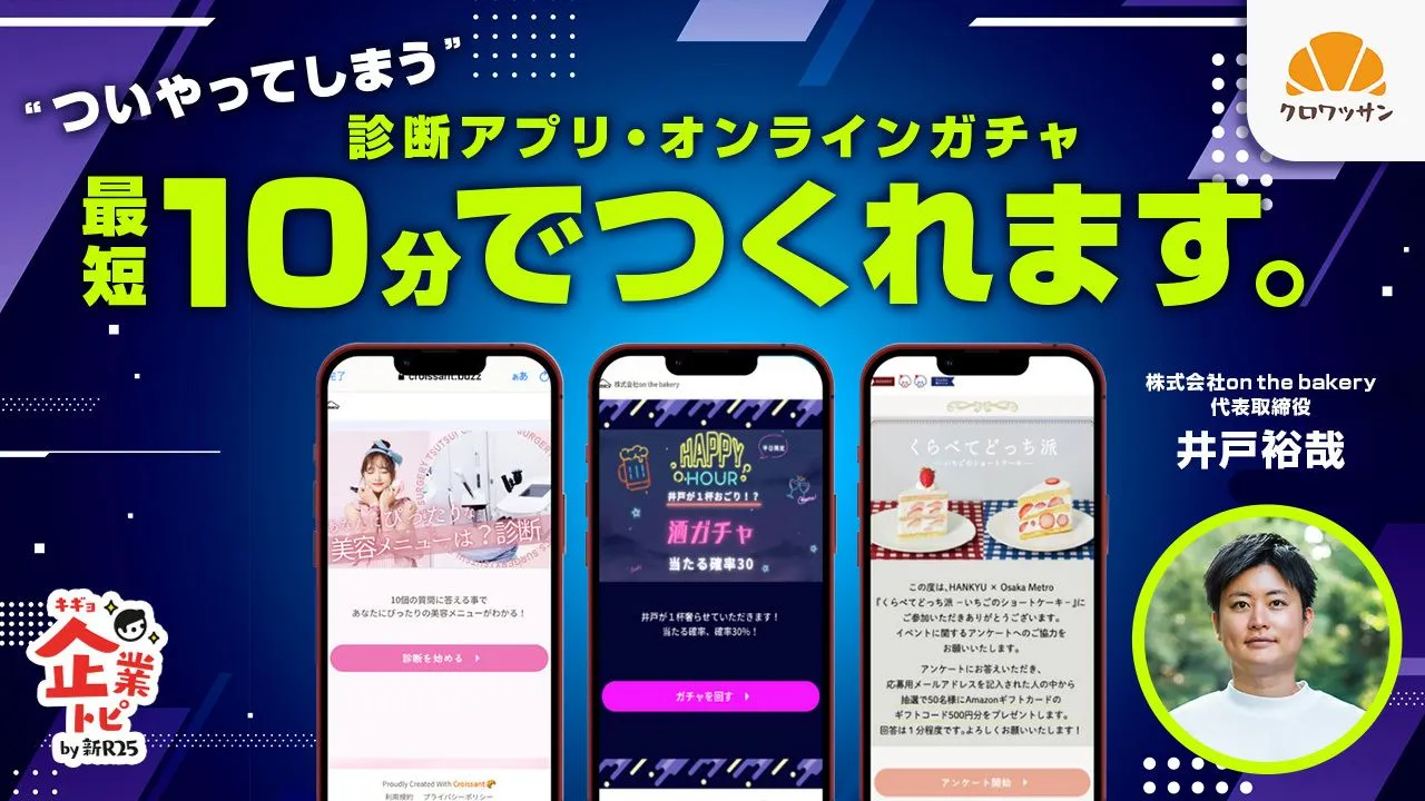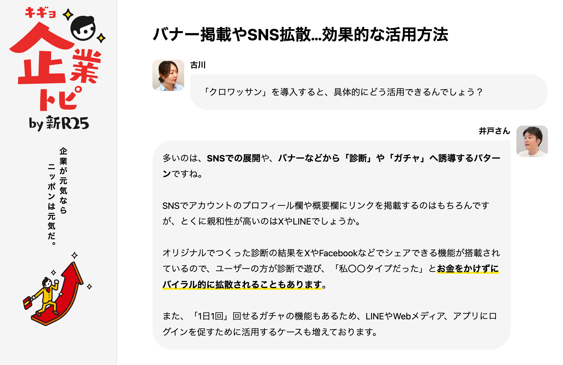 新R25の記事では「ついついやってしまう魅力…安価&直感的にオンラインガチャ・診断アプリを制作できる「クロワッサン」の実力」というタイトルで、クロワッサンの4つの強みや、活用事例について詳しく紹介されています。