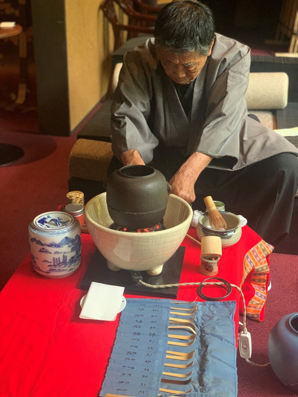 私は今年で77歳となり松坂屋本店には4年勤務しています。普段の業務は360年続く松坂屋本店の設備の保守を担当しています。茶道は約14年の経験がありますが、自分の得意や知識、経験を海外のお客様に提供できる機会をいただき、新たなやる気に繋がり気分も若返ってます。英語は話せませんが言葉の面はスタッフがサポートしてくれます。何よりも海外のお客様と言葉を超えた感情コミュニケーションがとても楽しく嬉しくもあり、もっとこの感動を多くの海外のお客様に届けたいです。