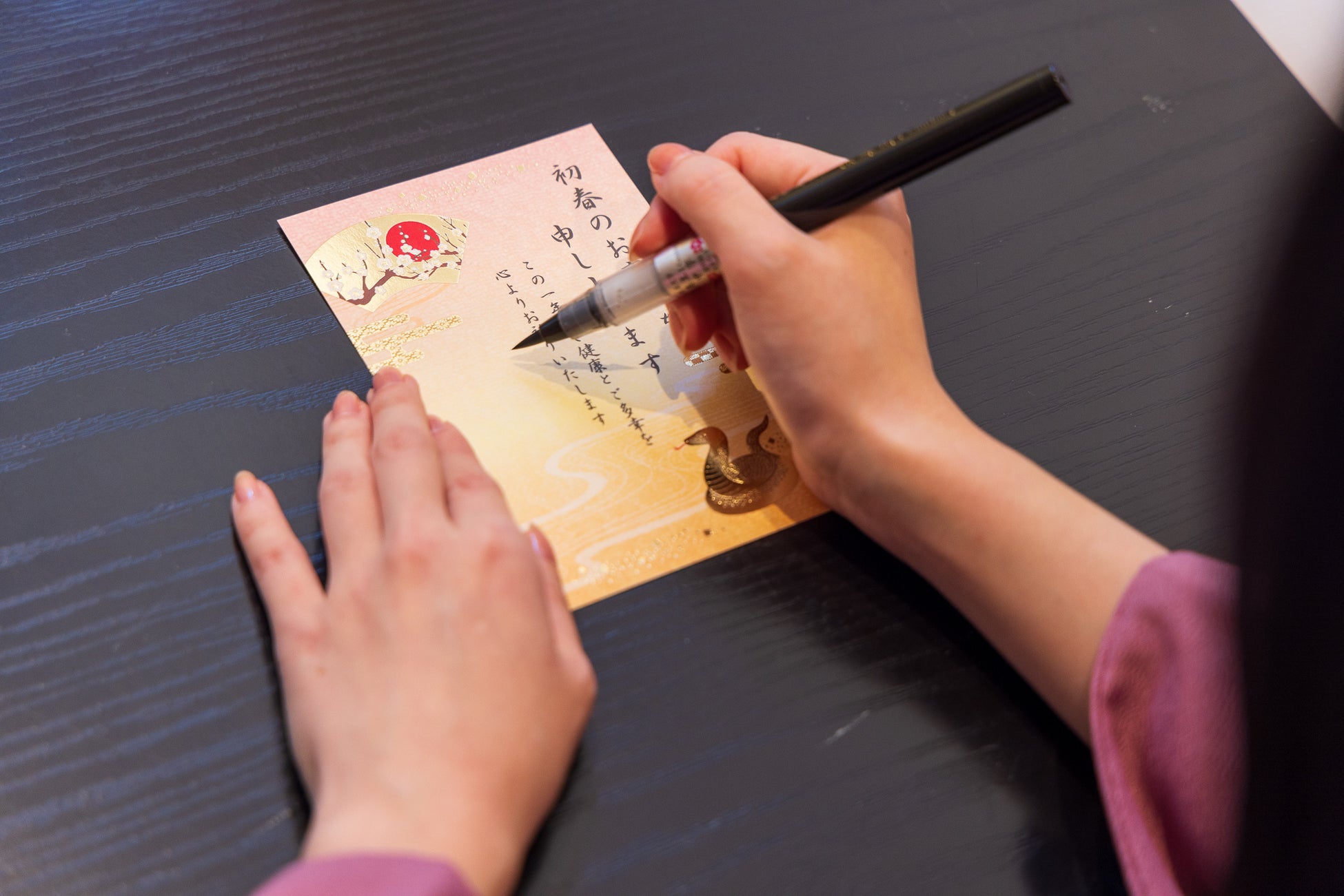 ご滞在中にチェキで撮影した写真をプリントし、筆で年賀はがきを作成できるプランです。完成した年賀状は、ご家族やご友人など、指定住所へ郵送できます。