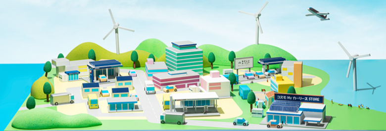また、脱炭素をめざす自治体や企業の皆様に対して、「コスモでんきビジネスグリーン」をはじめ、カーリース事業を活用したEVの導入や、自家消費用太陽光パネルの設置、電力使用量可視化による節電など、環境負荷軽減のための取り組みを支援してまいります。