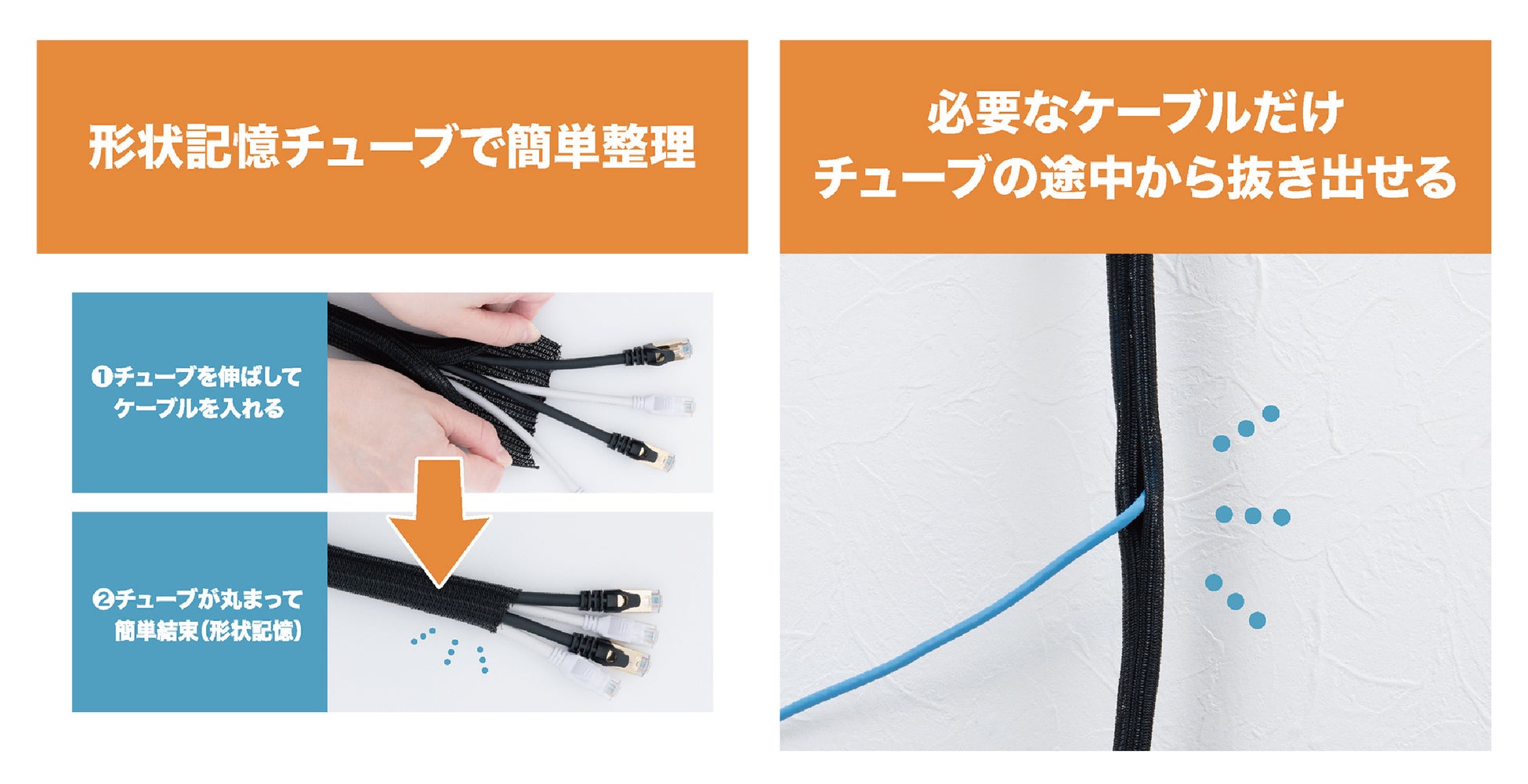 「ケーブルすっきりチューブ」はデバイスのケーブルを簡単に、きれいにまとめることができる形状記憶チューブです。チューブを伸ばして広げ、ケーブルに巻き付けて固定するので配線を整理し、デスク周りを効率的に利用できます。