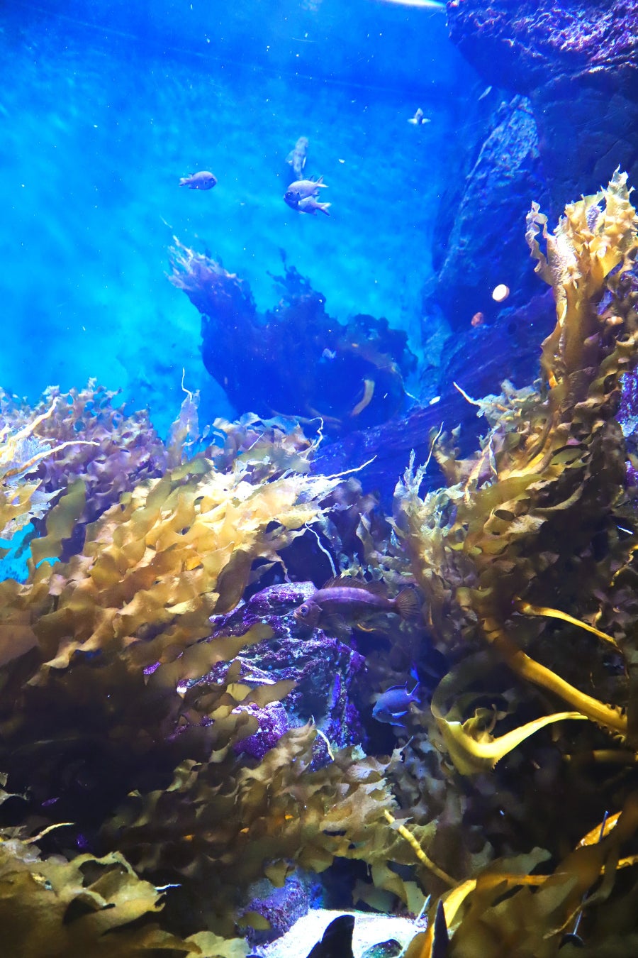 魚類だけではなく岩礁に生える海藻にも興味を持ってもらい、より自然に近い海の中を見ていただきたいと思い、展示を開始しました。ワカメの展示は去年に引き続き2回目となり、ワカメの生息する環境を水槽の中で再現し、長期飼育することを目指しています。