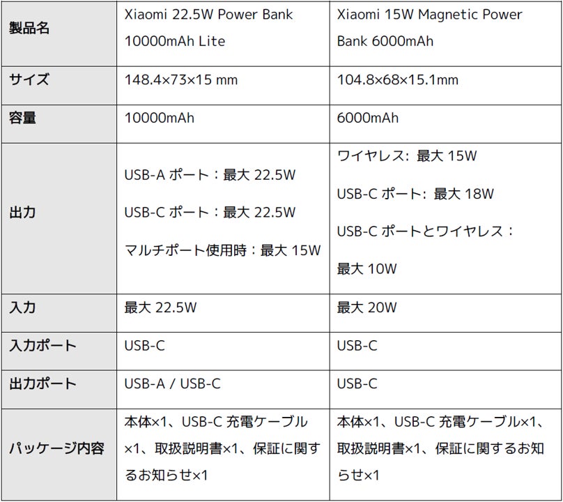 シャオミ・ジャパンが「Xiaomi 22.5W Power Bank 10000mAh Lite」、「Xiaomi 15W Magnetic Power Bank 6000mAh」を発表