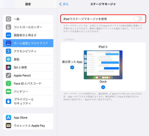 - 「設定」>「一般」>「ホーム画面とマルチタスク」>「ステージマネージャ」と進みます。