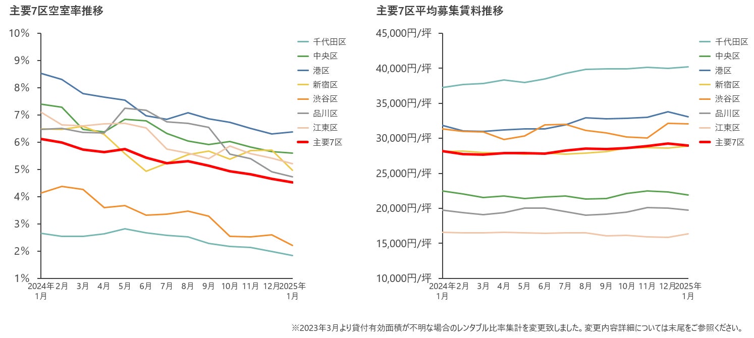 三菱地所リアルエステートサービス株式会社(本社:東京都千代田区大手町1-9-2、代表取締役社⾧:湯浅哲生)は、2025年1月末時点の東京主要7区(千代田区、中央区、港区、新宿区、渋谷区、品川区、江東区)の大規模オフィスビル※1の空室率・平均募集賃料調査を実施し、この度、調査結果がまとまりましたので、お知らせします。