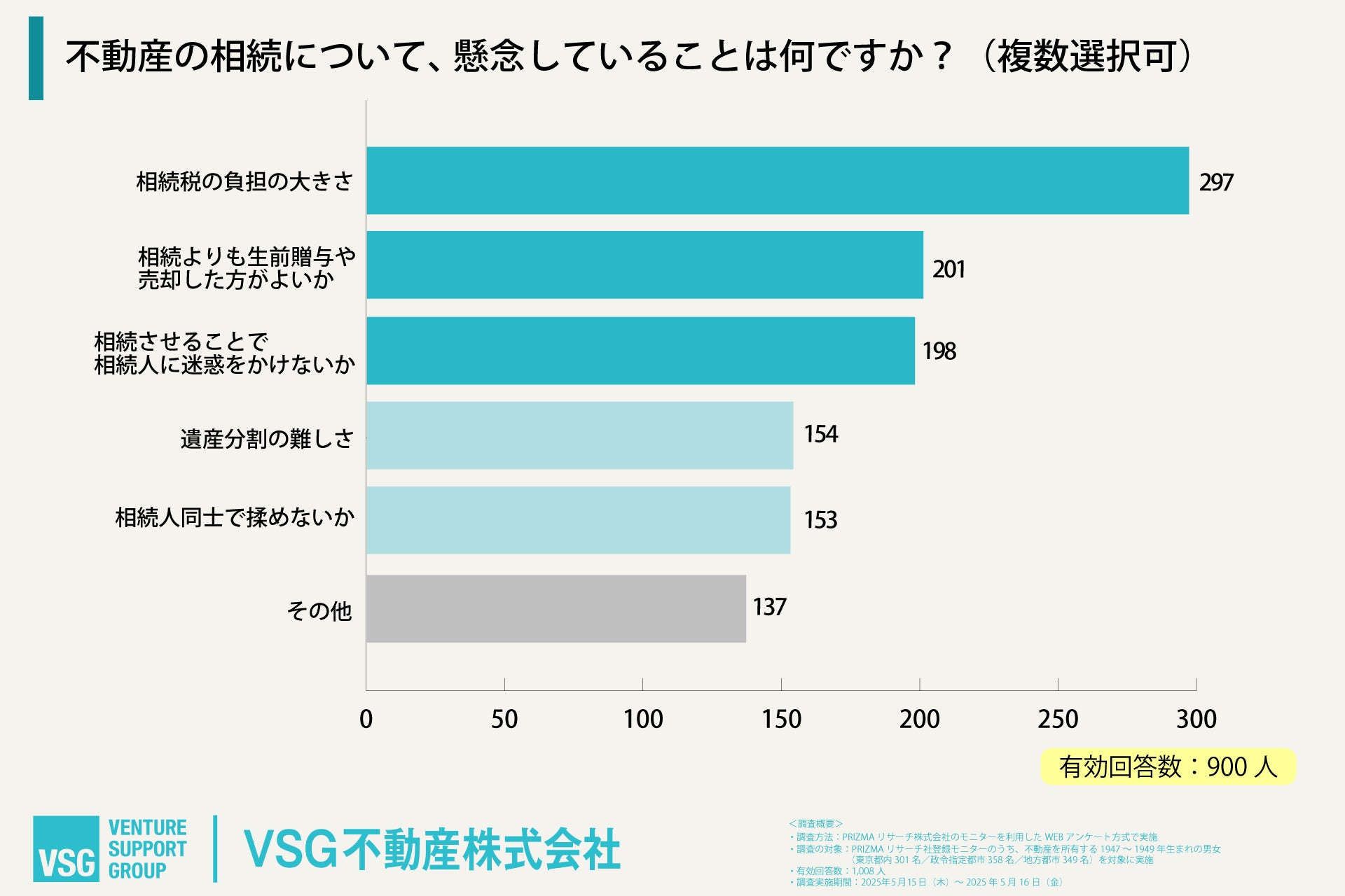 不動産相続に関して、最も多くの回答者が「相続税の負担の大きさ」を懸念していることが分かる。不動産は高額な資産であり、その評価額が相続税の計算に大きく影響するため、相続税が重くなることに対する不安が強い。相続税対策としては、生前贈与や不動産売却が考えられるが、これらの選択肢について十分に理解し、計画的に対策を講じることが重要である。