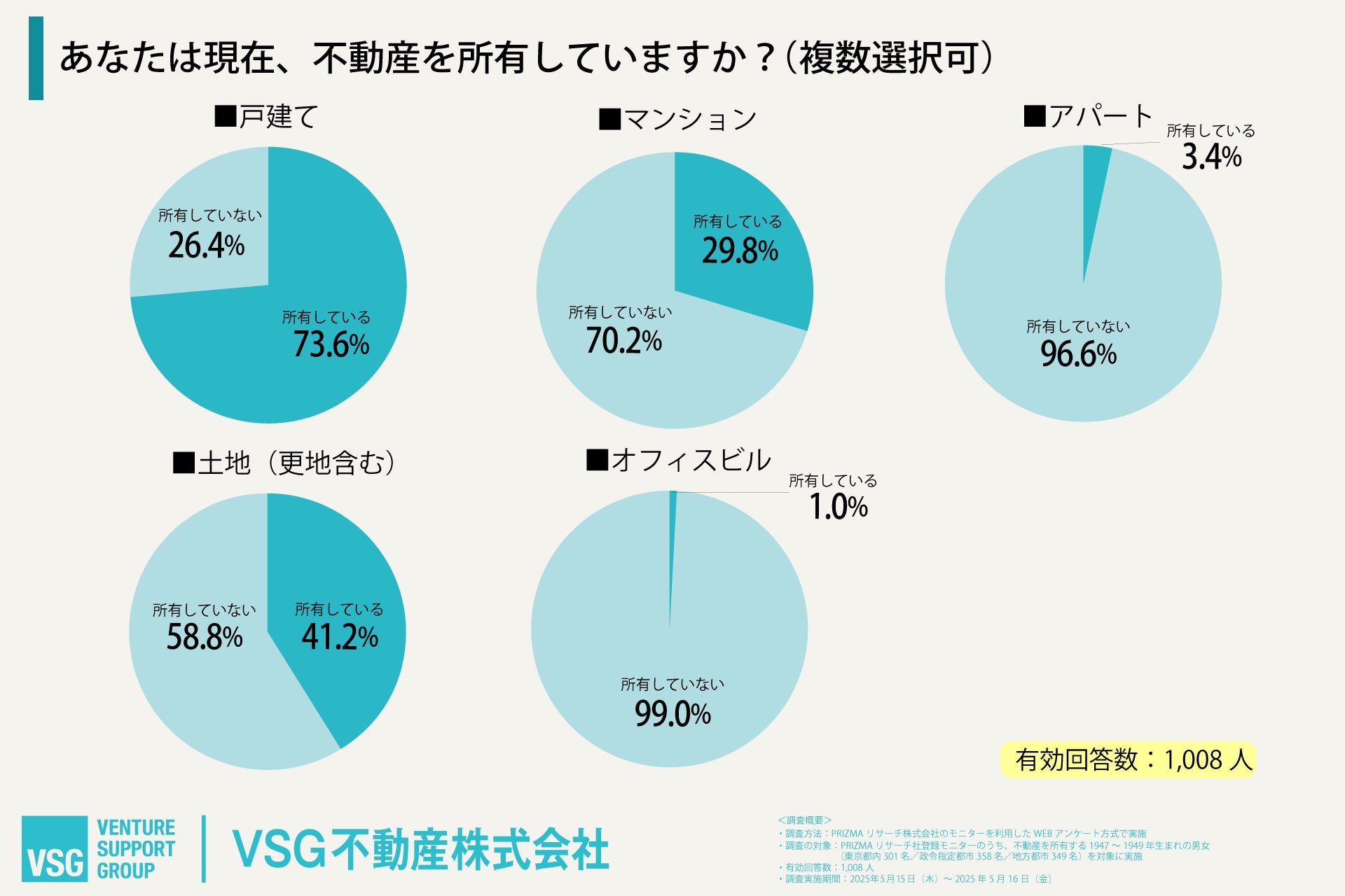 VSG不動産株式会社(所在地:東京都渋谷区、代表取締役:内田和希)は、「団塊世代の所有不動産」に関する意識調査を実施しましたので、お知らせいたします。