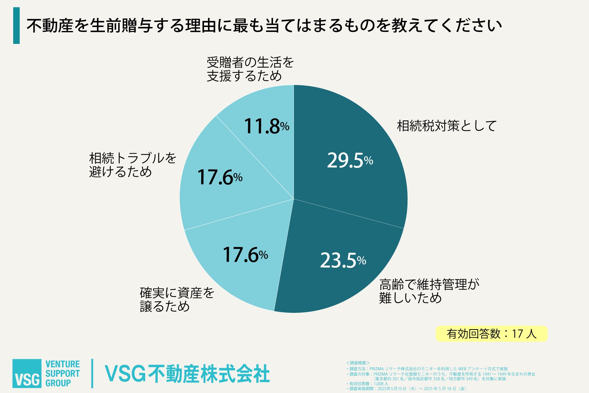「生前贈与する」と回答した人に、「不動産を生前贈与する理由に最も当てはまるものを教えてください」と質問したところ、「相続税対策として(29.5%)」と回答した人が最も多く、次いで「高齢で維持管理が難しいため(23.5%)」「確実に資産を譲るため(17.6%)」「相続トラブルを避けるため(17.6%)」「受贈者の生活を支援するため(11.8%)」と続いた。