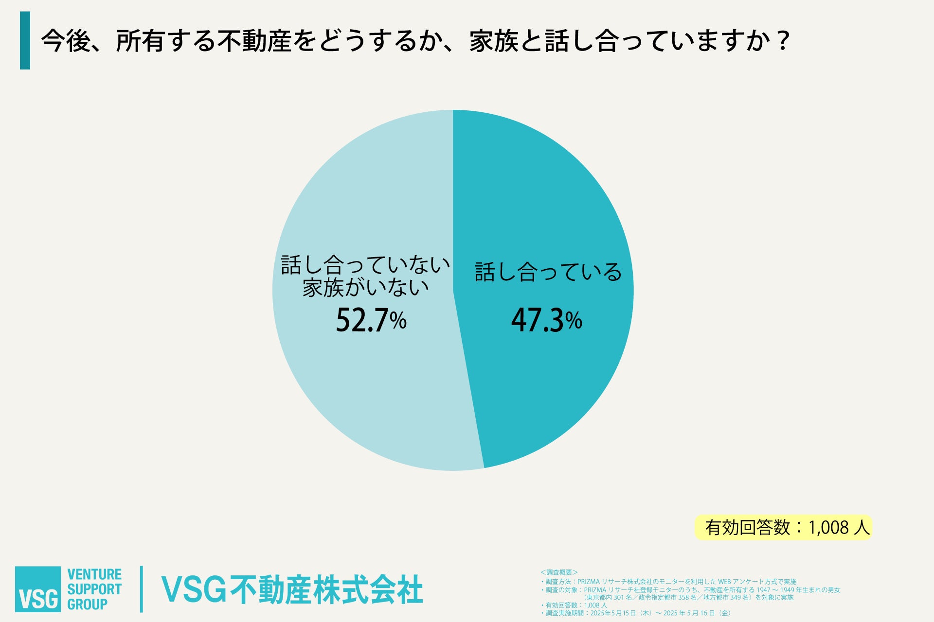 「今後、所有する不動産をどうするか、家族と話し合っていますか?」と質問したところ、「話し合っている(47.3%)」「話し合っていない・家族がいない(52.7%)」という回答結果となった。