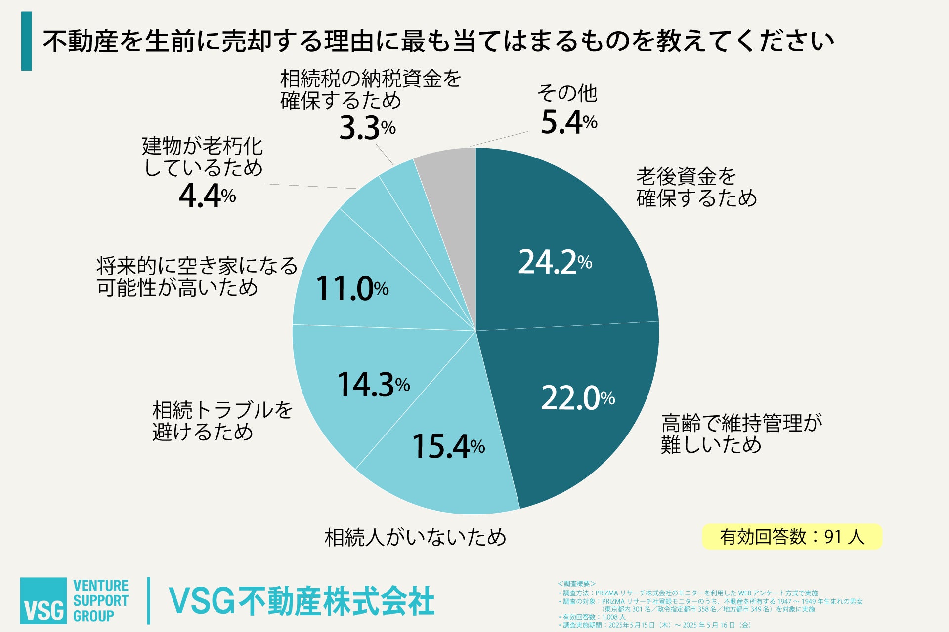 「生前に売却する」と回答した人に、「不動産を生前に売却する理由に最も当てはまるものを教えてください」と質問したところ、「老後資金を確保するため(24.2%)」と回答した人が最も多く、次いで「高齢で維持管理が難しいため(22.0%)」「相続人がいないため(15.4%)」「相続トラブルを避けるため(14.3%)」「将来的に空き家になる可能性が高いため(11.0%)」「建物が老朽化しているため(4.4%)」「相続税の納税資金を確保するため(3.3% )」「その他(5.4%)」という回答結果となった。