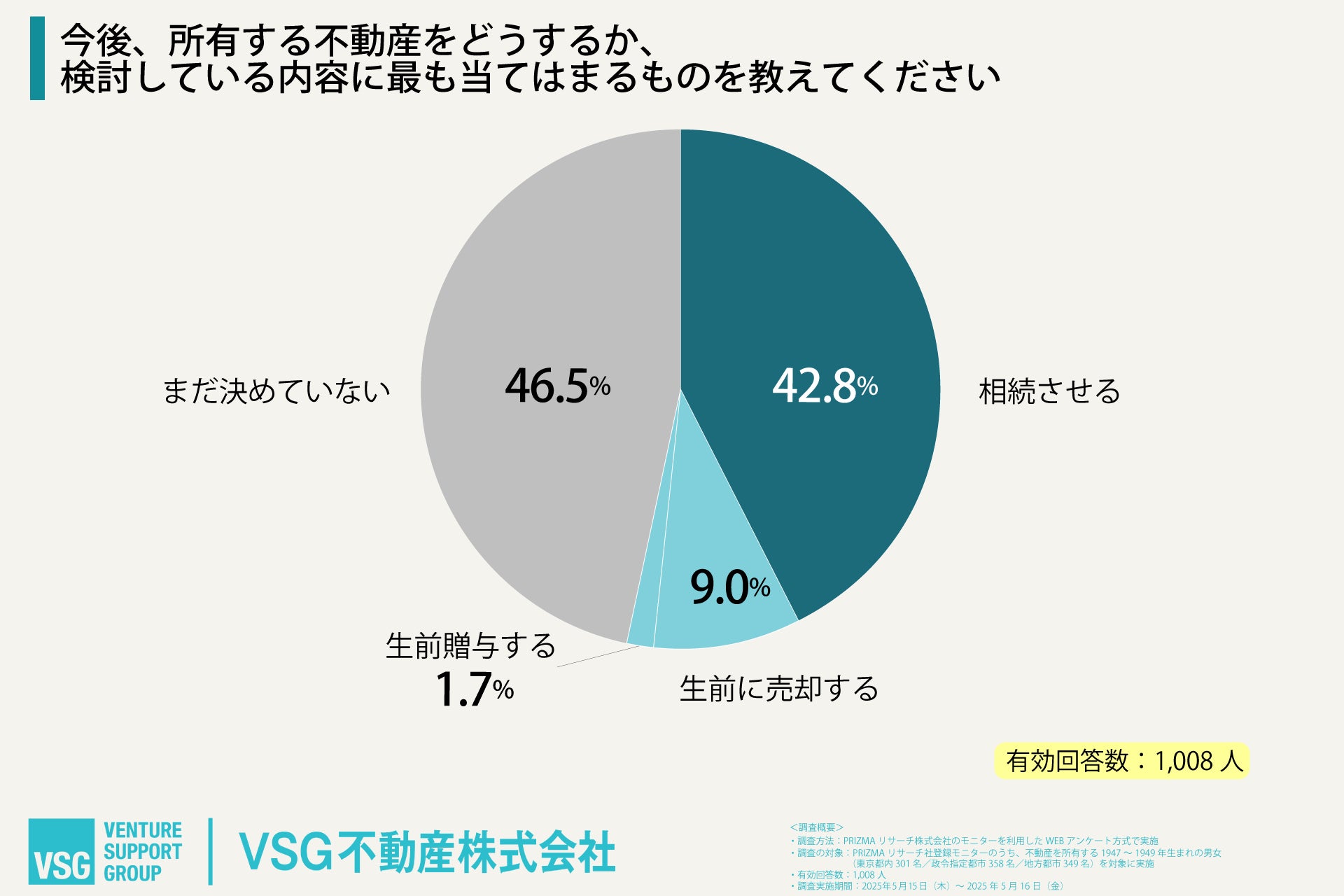 「今後、所有する不動産をどうするか、検討している内容に最も当てはまるものを教えてください」と質問したところ、「相続させる(42.8%)」「生前に売却する(9.0%)」「生前贈与する(1.7%)」「まだ決めていない(46.5%)」という回答結果となった。
