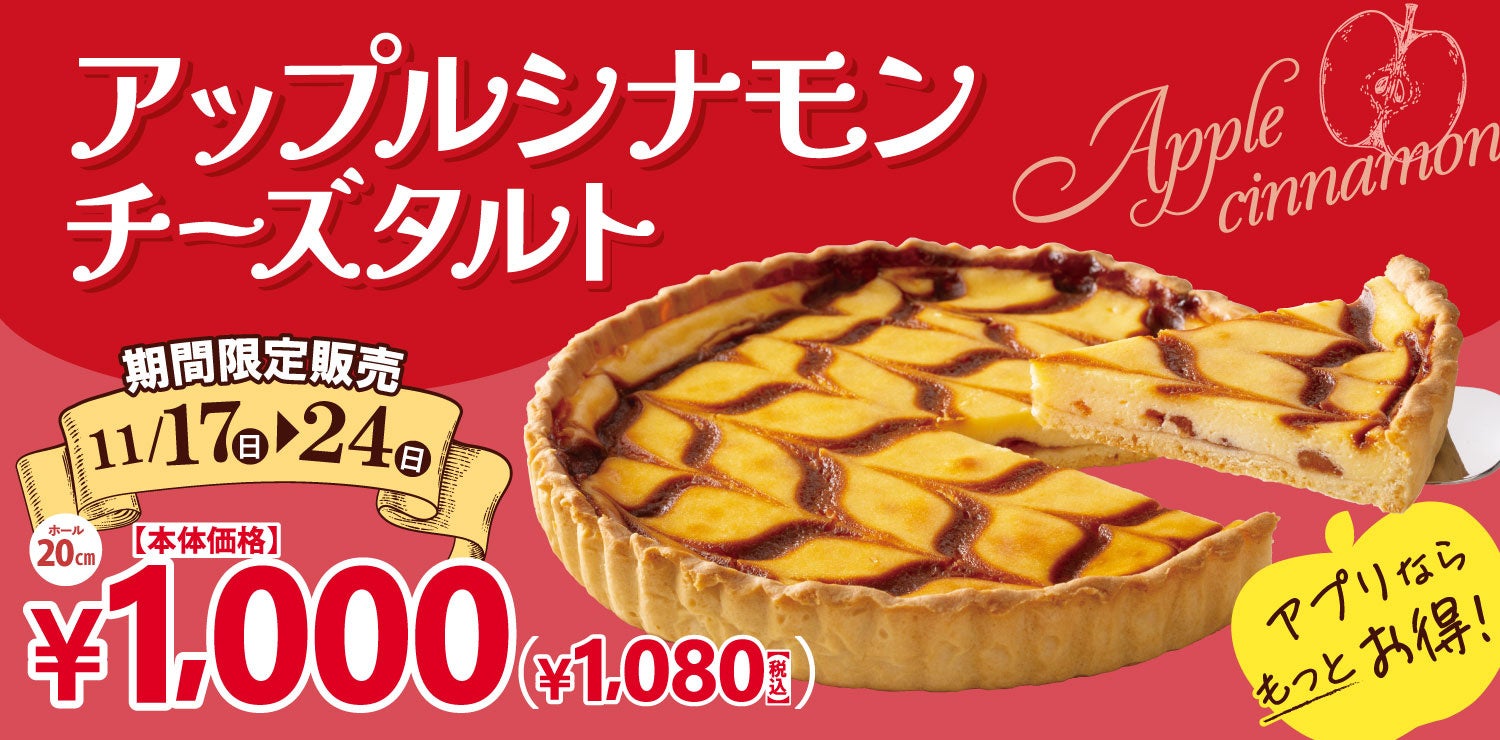 2024年11月17日(日)~24日(日)の期間中には、「アップルシナモンチーズタルト(20cm)」が店頭特価価格よりもさらにお得な“本体価格950円(税込1,026円)”になるクーポン配信キャンペーンを開催します。