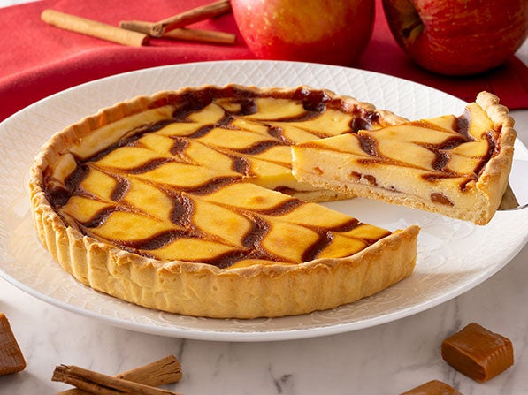 アップルシナモンジャムを入れたマイルドな酸味のチーズタルトにキャラメルソースで模様をつけて焼き上げました。