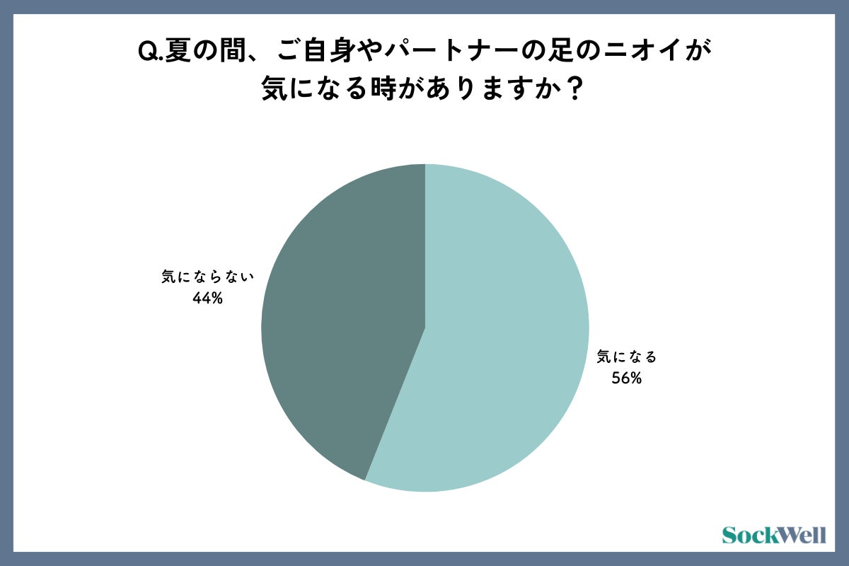 「夏の間、ご自身やパートナーの足のニオイが気になる時がありますか?」という質問に対して、56%もの回答者が「気になる」と答えました。この数字は、夏の季節において足のニオイが多くの人々にとって非常に重要な問題であることを示しています。特に高温多湿な環境が続く夏場は、汗をかきやすく、足の蒸れやすさがニオイの元となることが多いため、その対策が必要とされています。