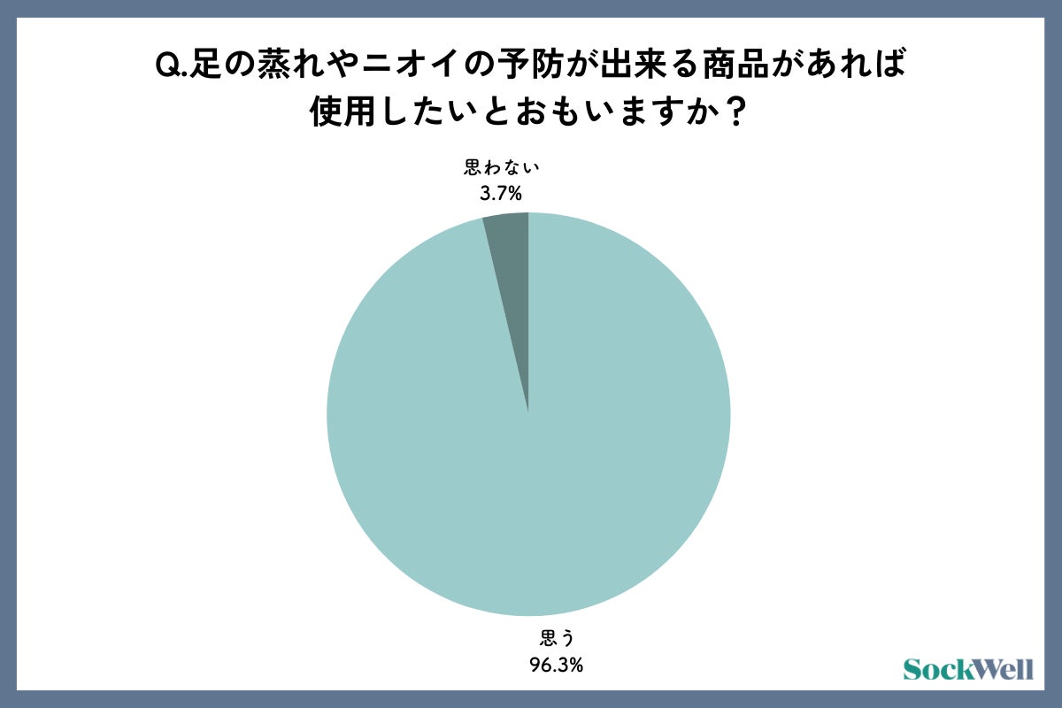「足の蒸れやニオイの予防が出来る商品があれば使用したいとおもいますか?」という質問に対して、96%という圧倒的多数の回答者が「思う」と答えました。この結果から、防臭効果のある商品の需要が非常に高いことが明らかになりました。