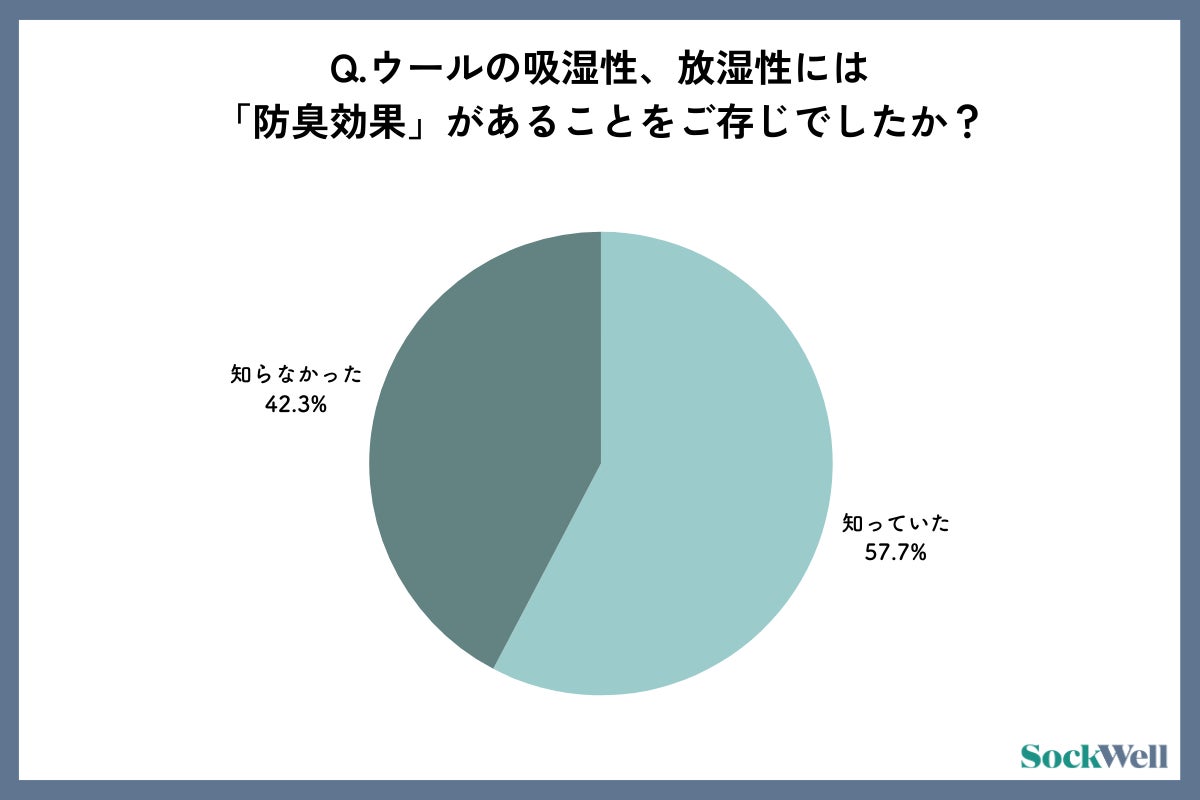「ウールの吸湿性、放湿性には『防臭効果』があることをご存じでしたか?」という質問に対して、58%の回答者が「知っていた」と回答しました。これは、過半数の人々がウールの特長やその利点について認識していることを示しています。ウールは天然の素材であり、高い吸湿性と放湿性を持つことから、汗を効果的に吸収して蒸発させるため、防臭効果があります。