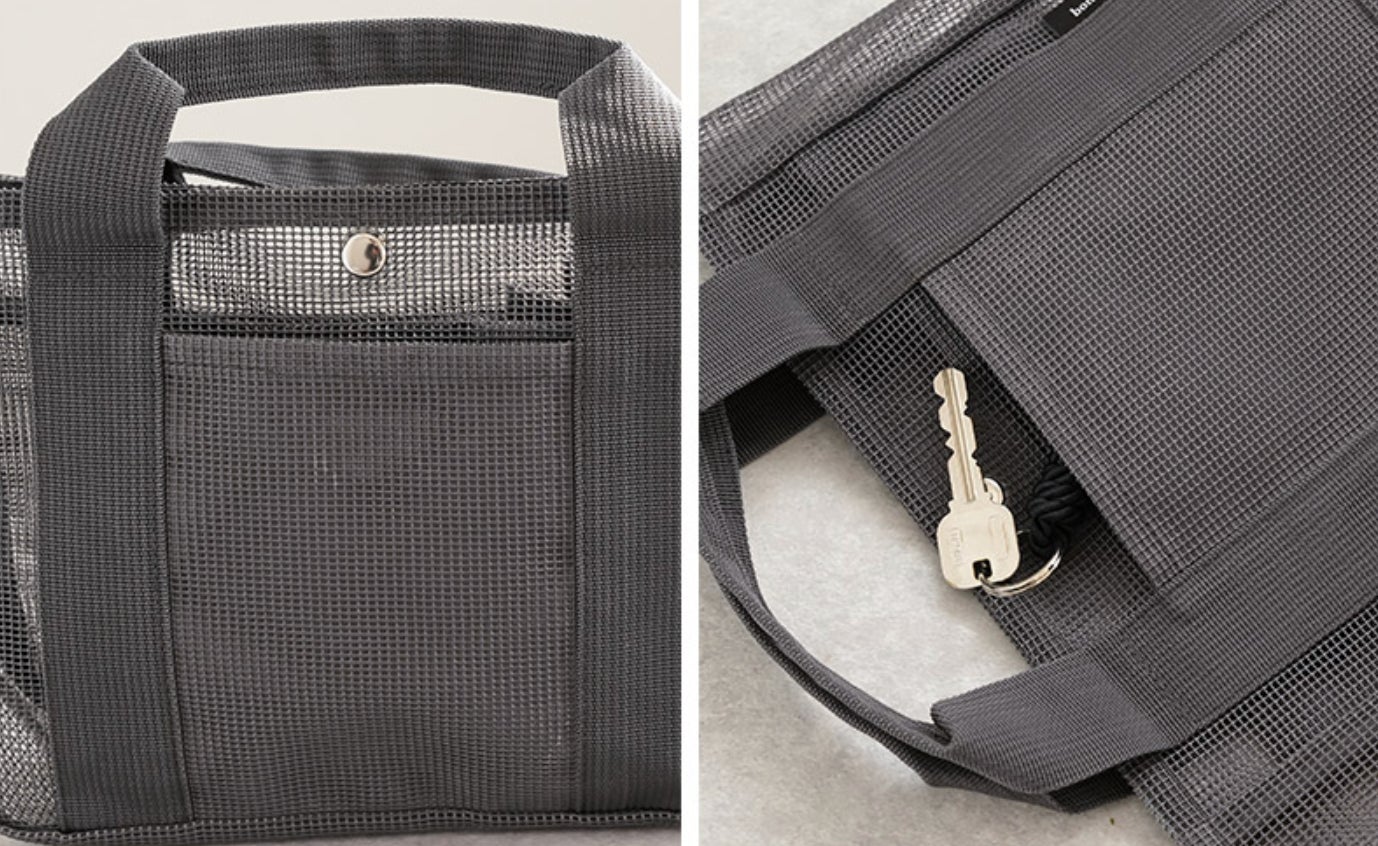外側にも、表と裏の両面にポケットが付いています。メッシュ素材ですが中身が見えない仕様なので、ロッカーの鍵や小銭入れなどにもぴったり。