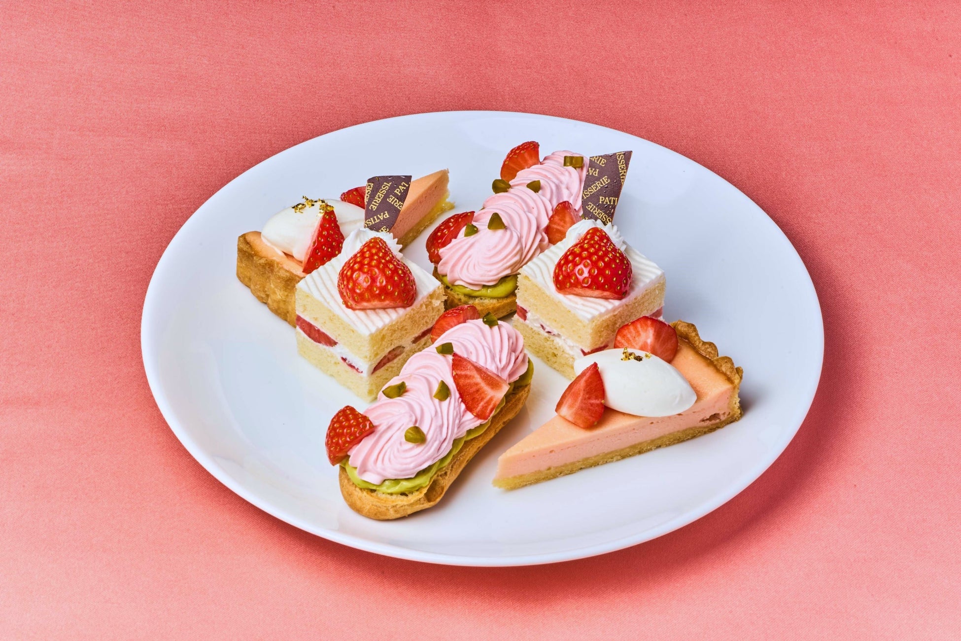 〈上段〉ショコラルージュ、ショコラフレーズ〈中段〉タルトフレーズ フロマージュ、いちごとピスタチオのエクレール、いちごのショートケーキ〈グラス〉プリンパンナコッタ
