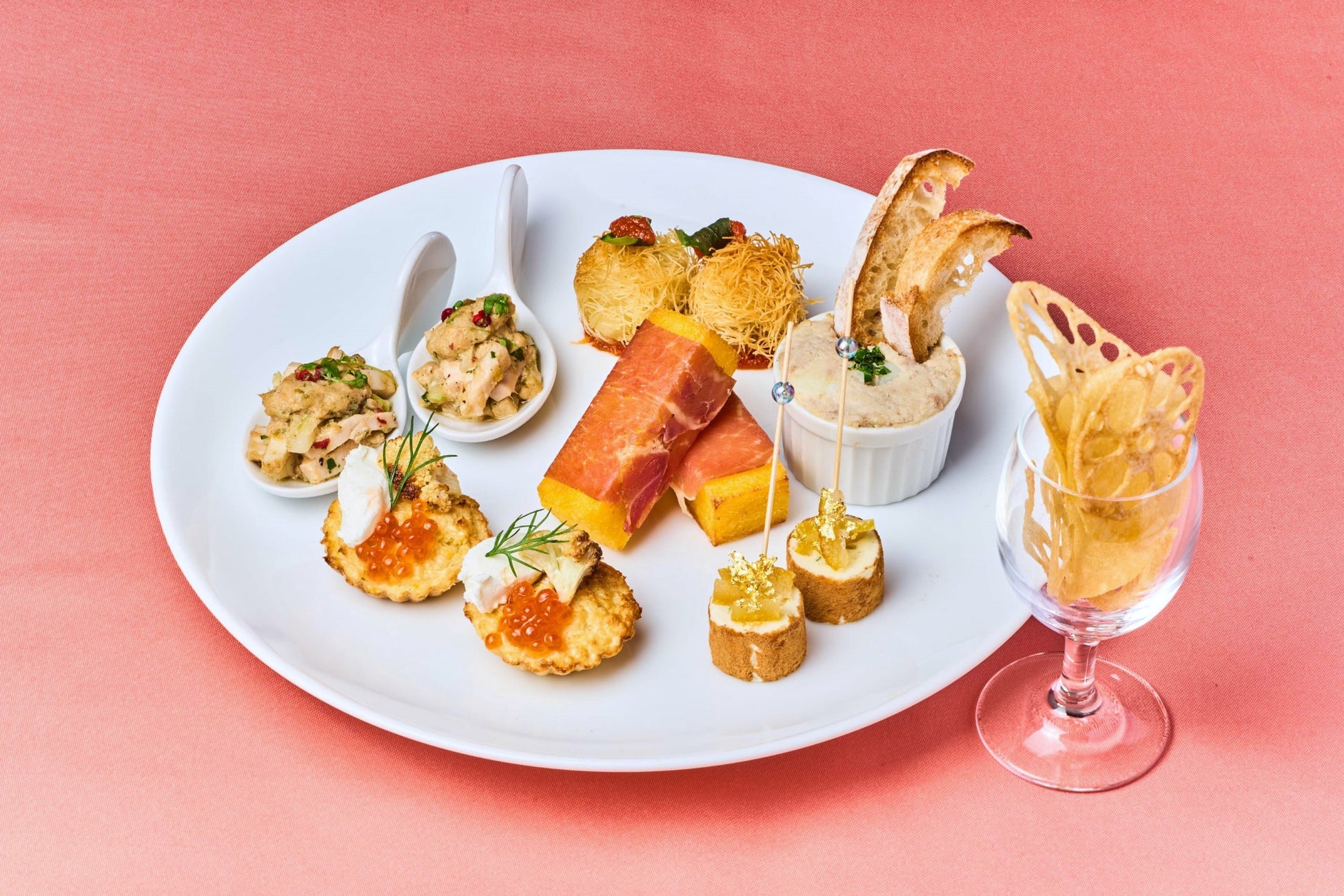 鱈の真子のブランダード、ポレンタの生ハム巻き、モッツァレラチーズとカダイフのボール、石川県産ゆずとクリームチーズのピンチョス、カリフラワーのタルト いくらとヨーグルトソース、能登豚のトンナート いしる風味、菊芋と加賀蓮根のチップス