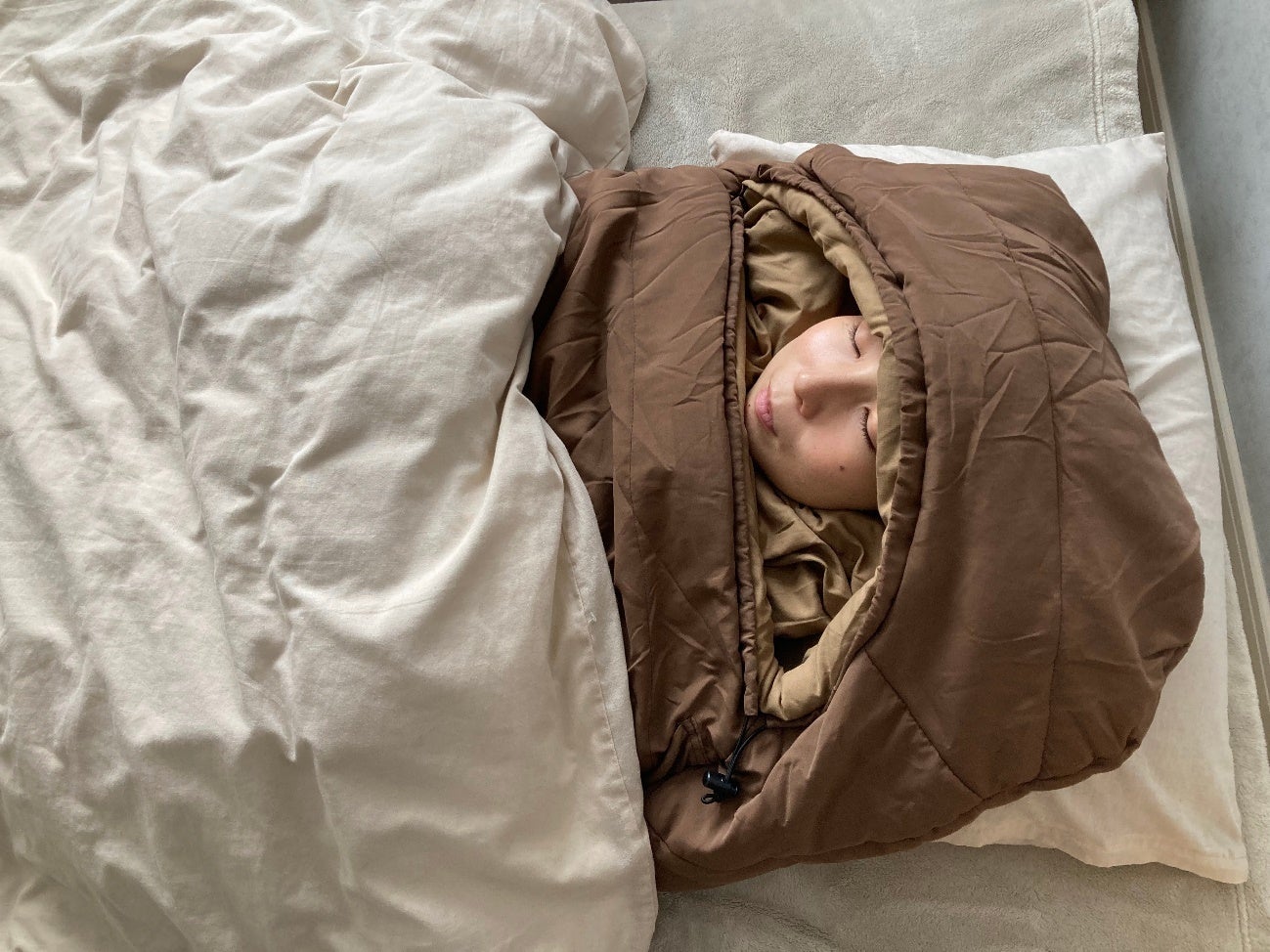 軽くてふかふか。肩から足先までしっかり保温でき、冷気が入りにくい構造。羽毛布団や毛布よりも暖かく、寒冷地でも快適に過ごせる。