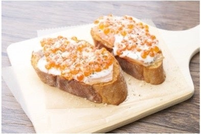 ブレッドの上に「シラリカいくら」、サーモン、サワークリームソースを贅沢にトッピングしました。お酒のお供にもぜひ。