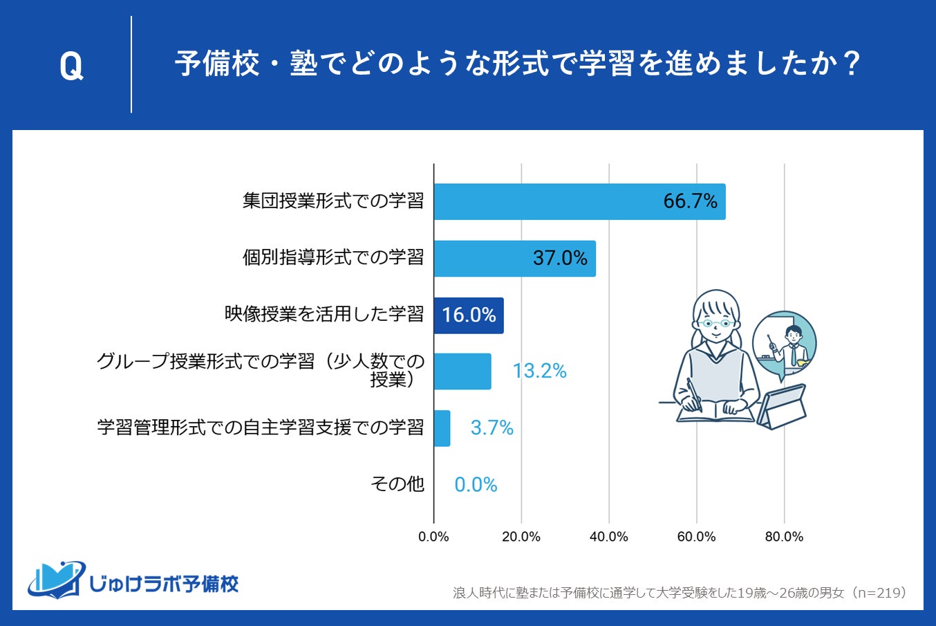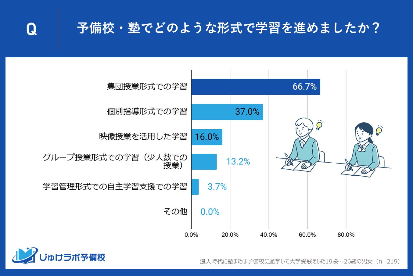 調査結果によると、最も多くの浪人生が選んだ学習スタイルは「集団授業形式」で、66.7%という高い割合を占めました。この結果から、多くの受験生が同じ目標を持つ仲間と切磋琢磨する環境を好む傾向が伺えます。