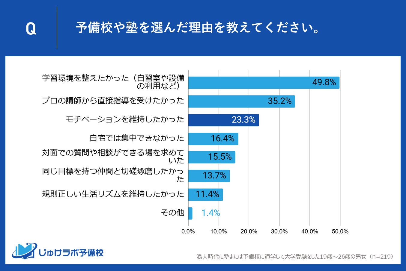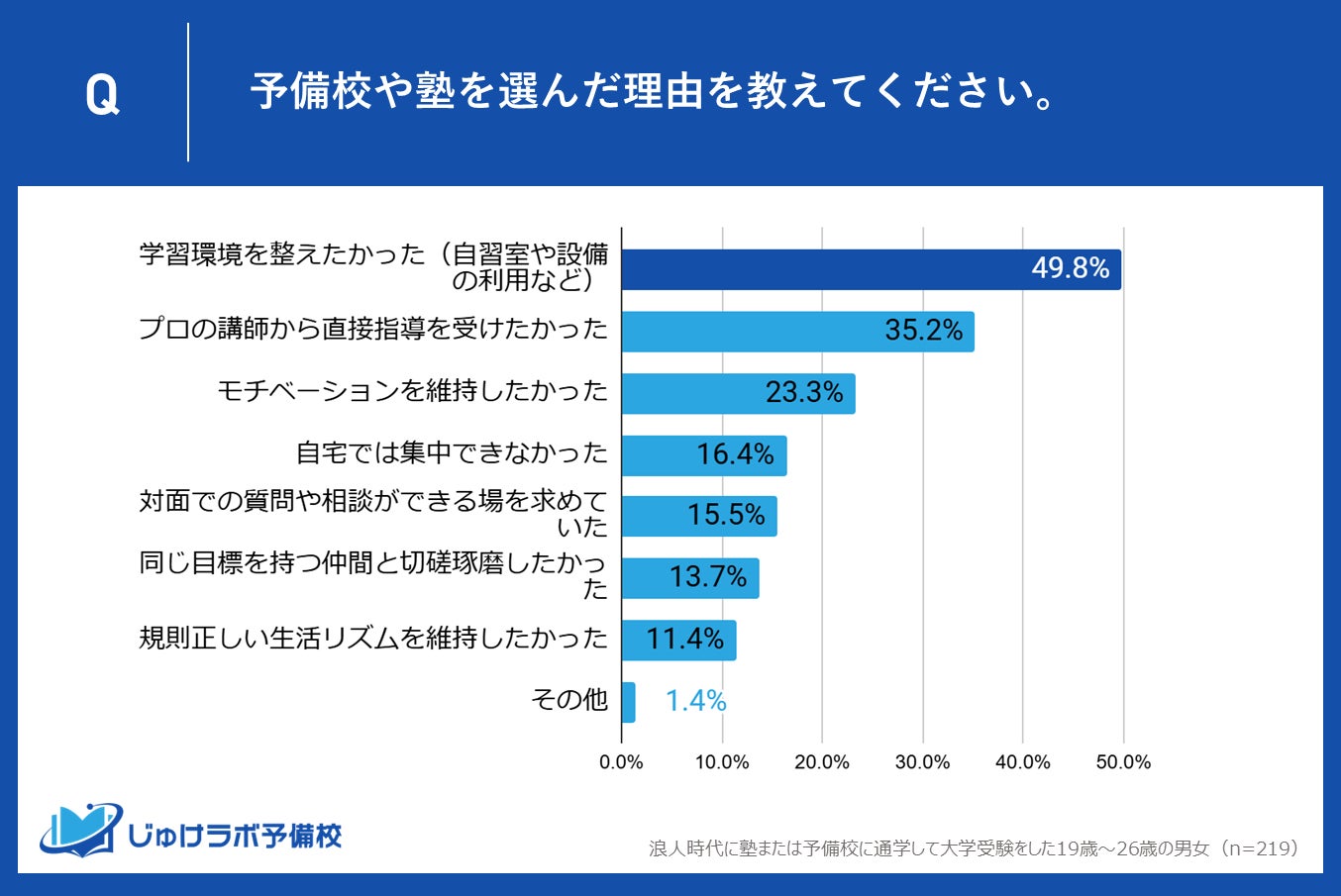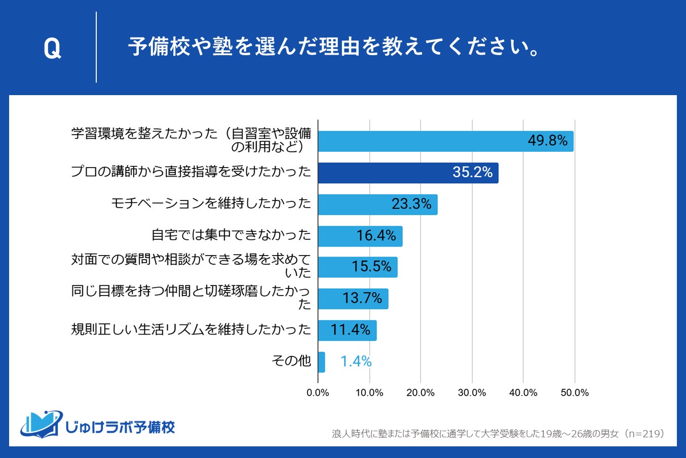 浪人生が予備校や塗を選ぶ理由として最も多かったのは「学習環境を整備したかった」という回答で、49.8%に上りました。次いで「プロの教師から直接指導を受けたかった」という回答が35.2%。この結果から、浮生生にとって学習の場そのものがどれほど重要かが浮きぼりになりました。