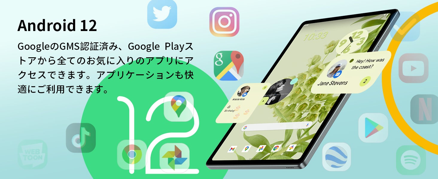 - Android12を搭載し、簡素化されたシステムインタラクションデザインと最適化された基礎システムコードにより、タブレットはよりスムーズで高速に動作します。 すべてのユーザーのために再設計されたUI、より良いプライバシー管理のためのセキュリティに焦点を当てた新しいプライバシー機能、プレミアムGoogleサービスやお気に入りのサードパーティアプリをインストールする機能を体験してください。
