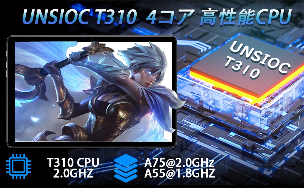 - UNSIOC製高性能 T310、4コア2.0Ghz CPUが搭載なので、少ない消費電力で高速な処理が可能です。動画などによりスムーズにお楽しみいただけます。