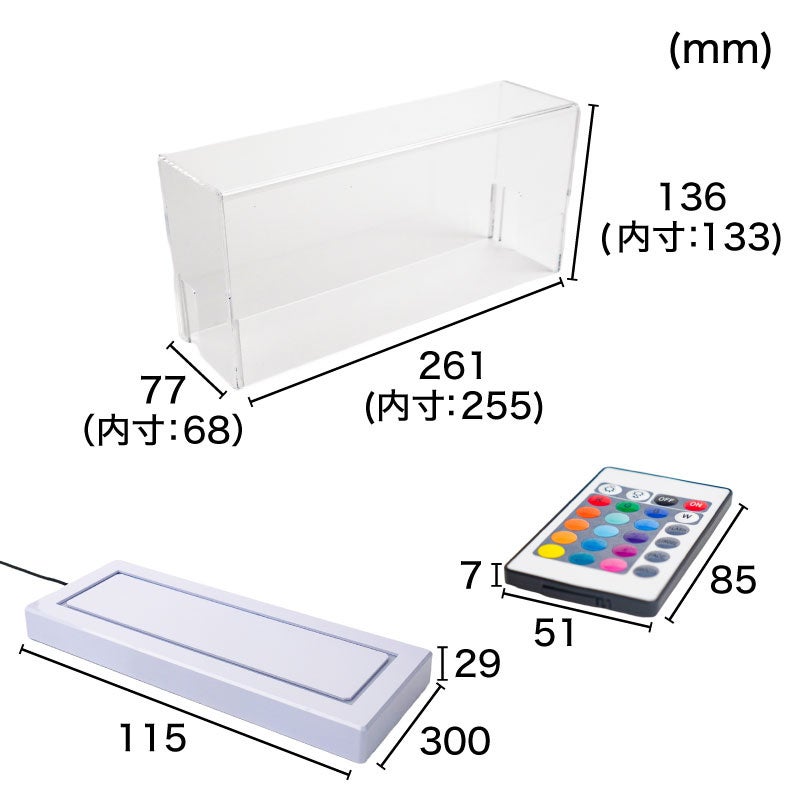 スタンドとアクリルカバー、リモコンが付属。USB給電式。サイズはスタンド幅300×高さ29×奥行115mm、スタンドの内寸は幅255×高さ133×奥行68mm。お手持ちのゲーム機を中に入れて飾ることができます。リモコンのボタンでLEDを点灯、16色の色や色が変化する4つのパターンのグラデーションモードを搭載。光の強さや点灯スピードも調整可能。カバー部の左右に通気口があり、ケーブルを通して飾ったままゲームをプレイ可能です。ゲーム機以外にもお気に入りのアクリルスタンドやフィギュアを中に入れて飾って楽しむこともできます。