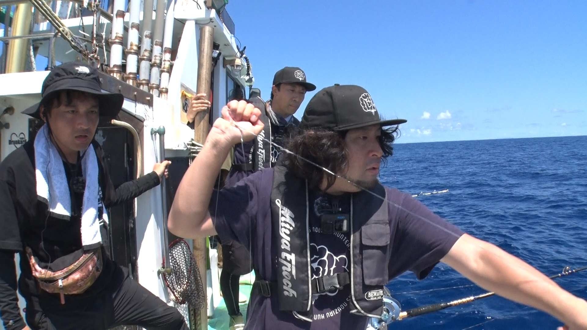 今回仕掛ける場所は水深2500m。なんと、スカイツリー4本分の深さになります。深海ともなれば、仕掛けを揚げるだけでも2、3時間はかかるため、チャレンジは1日で1回のみ。しかも海中には7〜8つの異なる潮の流れがあり、その影響を受けながら海底まで仕掛けを下ろすのは至難の業だといいます。ポイントに到着すると餌となるサバとイカ、疑似餌をつけた糸を投入! しかし、リールに巻いておける糸の長さは1800mが限界。そのため今回は3つのリールをリレー方式でつなぎ合わせながら海底をめざします。増田さん独自の秘法で糸をつなぎ合わせ、見えない海の中の状況を把握しながら操船。未知の世界へと糸をおろしていきます。
