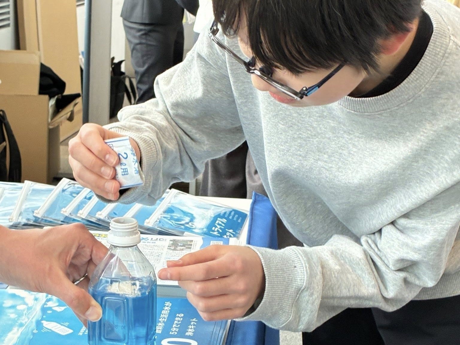 3月21日、新潟市の朱鷺メッセで開催された「第31回日本災害医学会総会・学術集会」に、アクアリピュアが出展しました。今回は、災害時医療の観点から、災害時の医療行為には水の確保が最重要であることを伝えるとともに、アクアリピュアがその有効な解決策になることをアピールしました。実演では絵の具で色付けをした水にアクアリピュアを入れて浄水し、来場者にアクアリピュアの浄水効果を確認してもらいました。