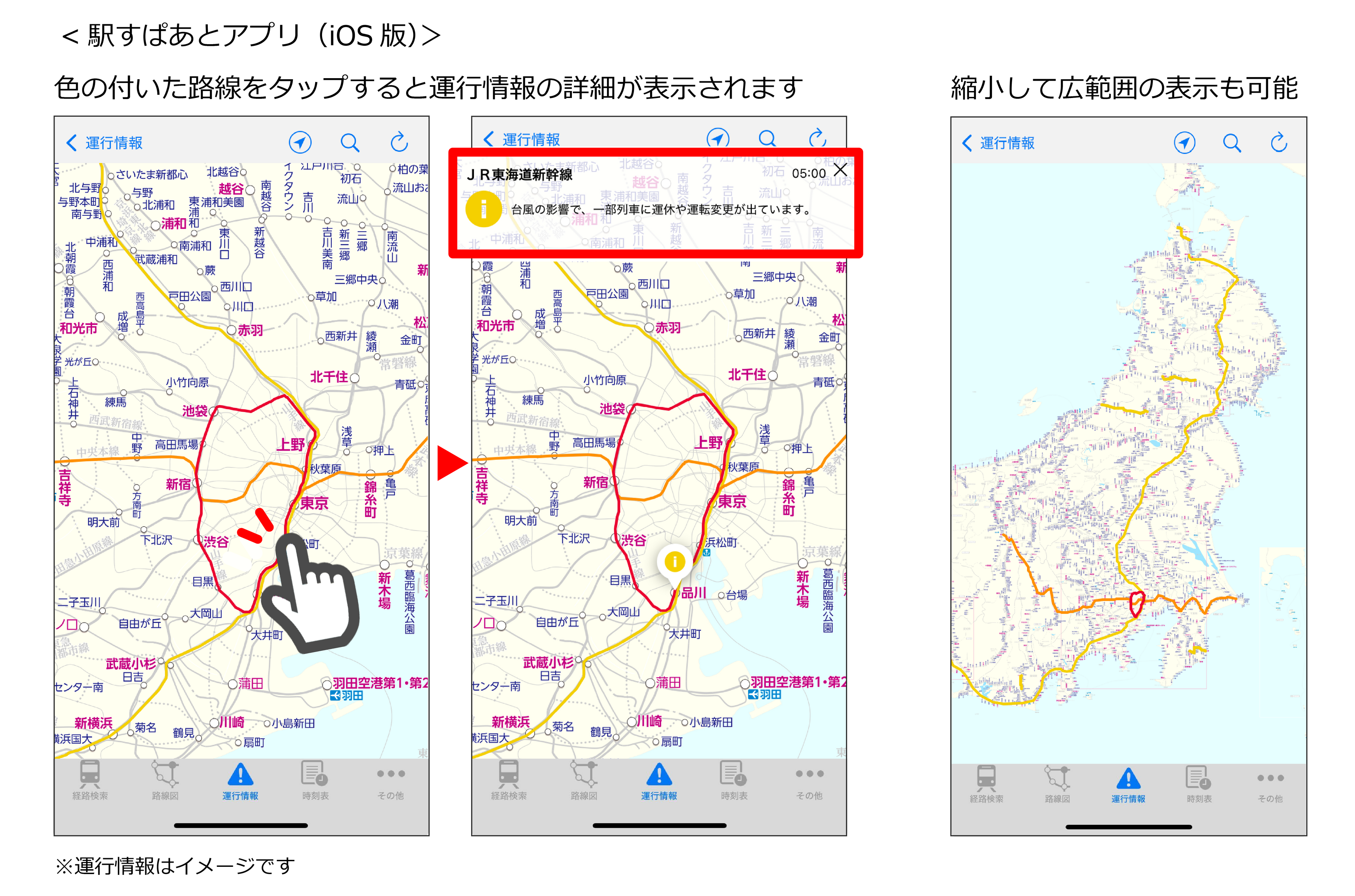 「駅すぱあとアプリ」および「駅すぱあと for web」では、鉄道でダイヤ乱れが発生した際に、30分以上(首都圏のJRでは15分以上)の遅延や運休といった運行状況によって対象範囲を路線図上で3段階に色分けし、ひと目で確認できるようアップデートしました。全国の鉄道※の状況をシームレスな1枚の路線図で表示するので、台風や大雪などの自然災害で影響が広範囲に渡る場合でも、複数路線の状況を比較して迂回路の検討ができます。文字だけの情報では分かりづらい各路線の位置関係も把握でき、土地勘のないエリアでの移動や複数の鉄道を乗り継ぐ必要がある際などにダイヤ乱れが発生した場合でも、すぐに状況にあった適切な判断ができるようサポートします。