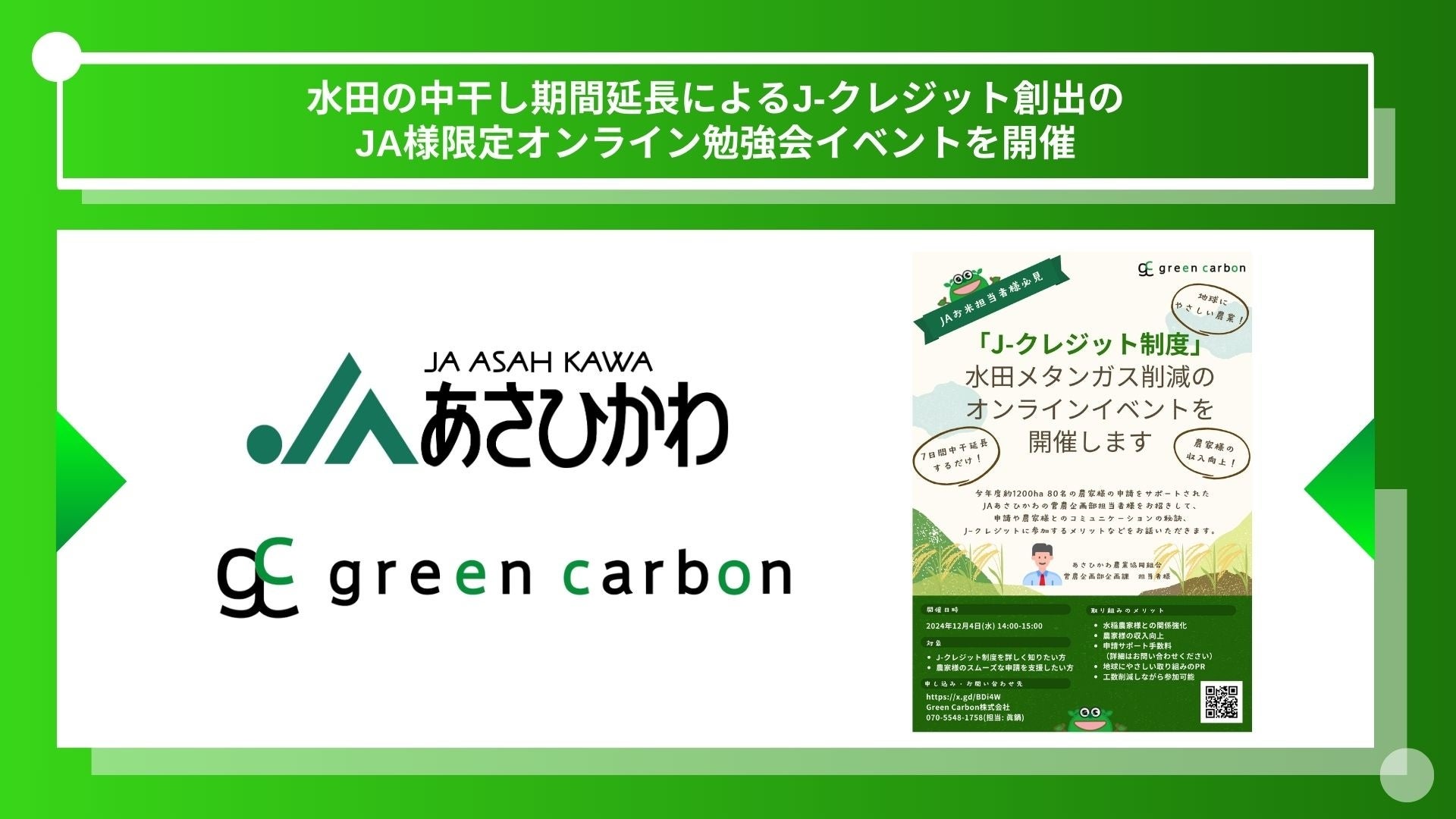 Green Carbon株式会社(代表取締役:大北潤、以下Green Carbon(読み;グリーンカーボン))はこの度、水田の中干し期間延長によるJ-クレジット創出に向けたJA(農業協同組合)様対象のオンライン勉強会イベント(以下、本イベント)を開催する運びとなりました。今回ゲスト登壇者としてJAあさひかわ様をお招きし、全国のJA様のご参加をお待ちしております。