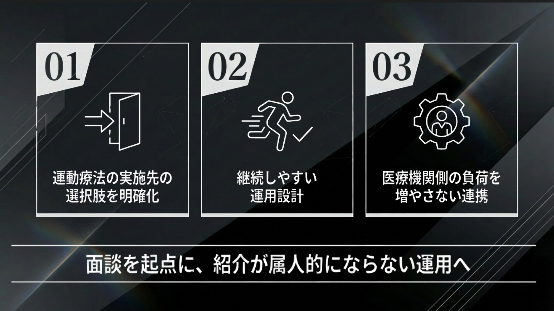 医療機関側にとっても、地域内に運動療法を継続的に実施できる施設が限られる場合、紹介や連携導線が属人的になり、患者様が運動へ移行できない課題が起きやすくなります。