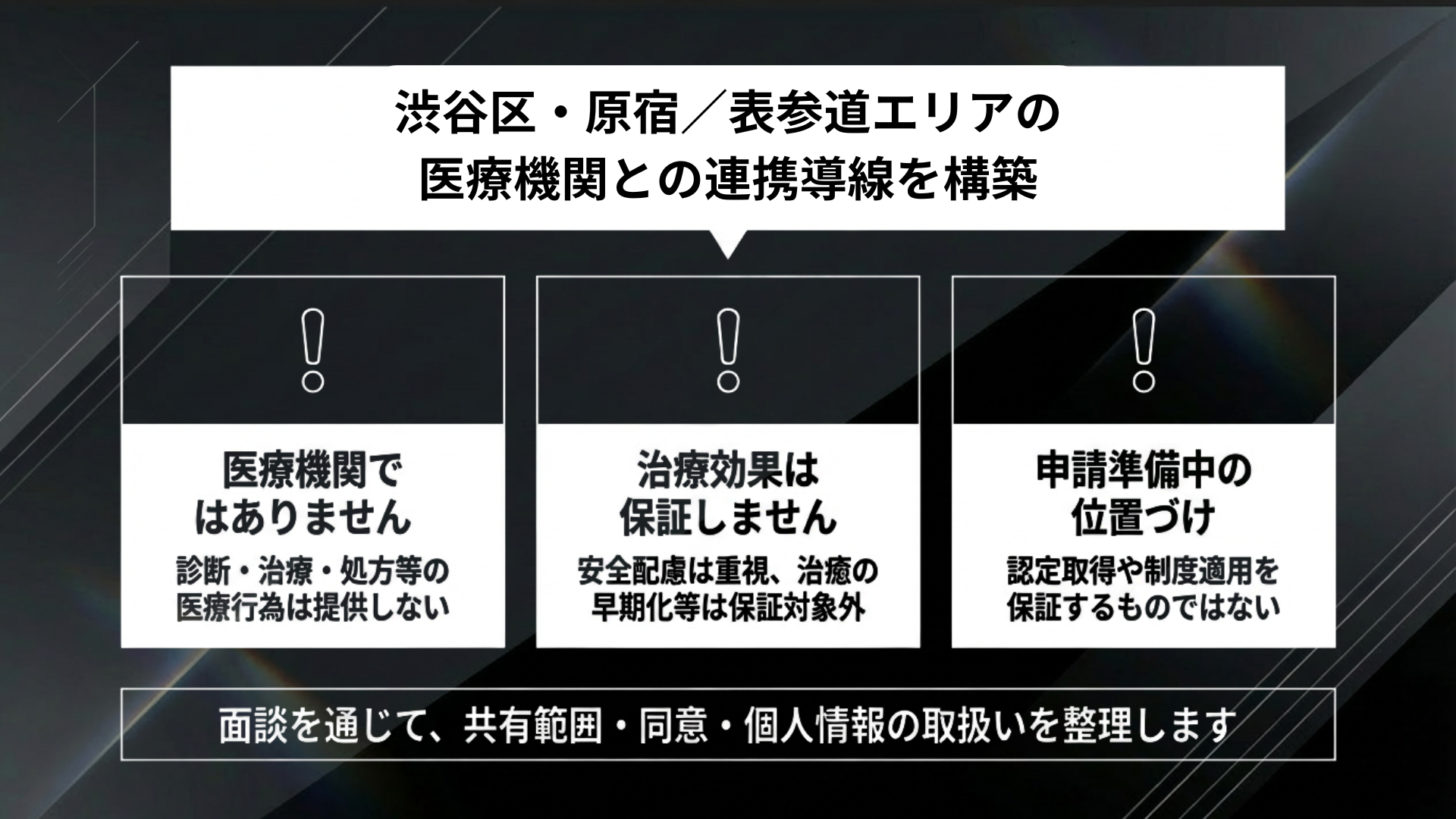 医療機関との連携方針(共有範囲、同意、個人情報の取扱い)は、面談で整理します