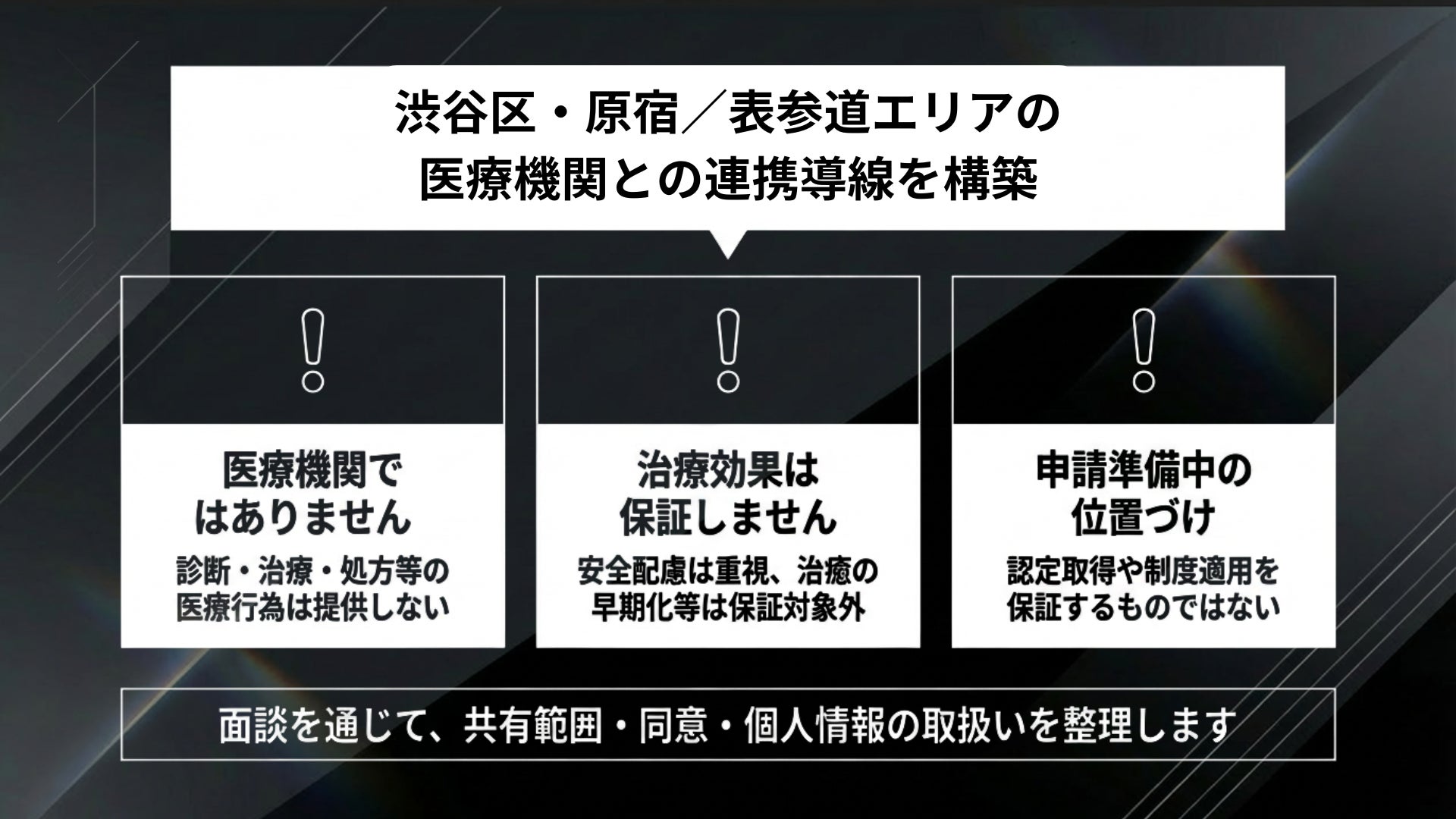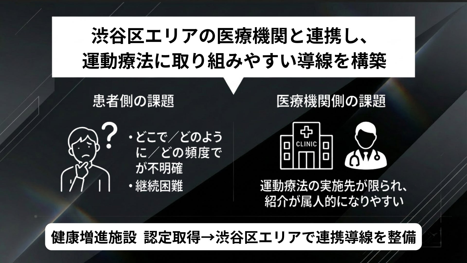 当社は健康増進施設としての運営体制を整備し、指定運動療法施設の申請準備を進める中で、渋谷区・原宿/表参道エリアの医療機関と連携し、患者様が運動療法に取り組みやすい導線と運用体制の構築を進めます。