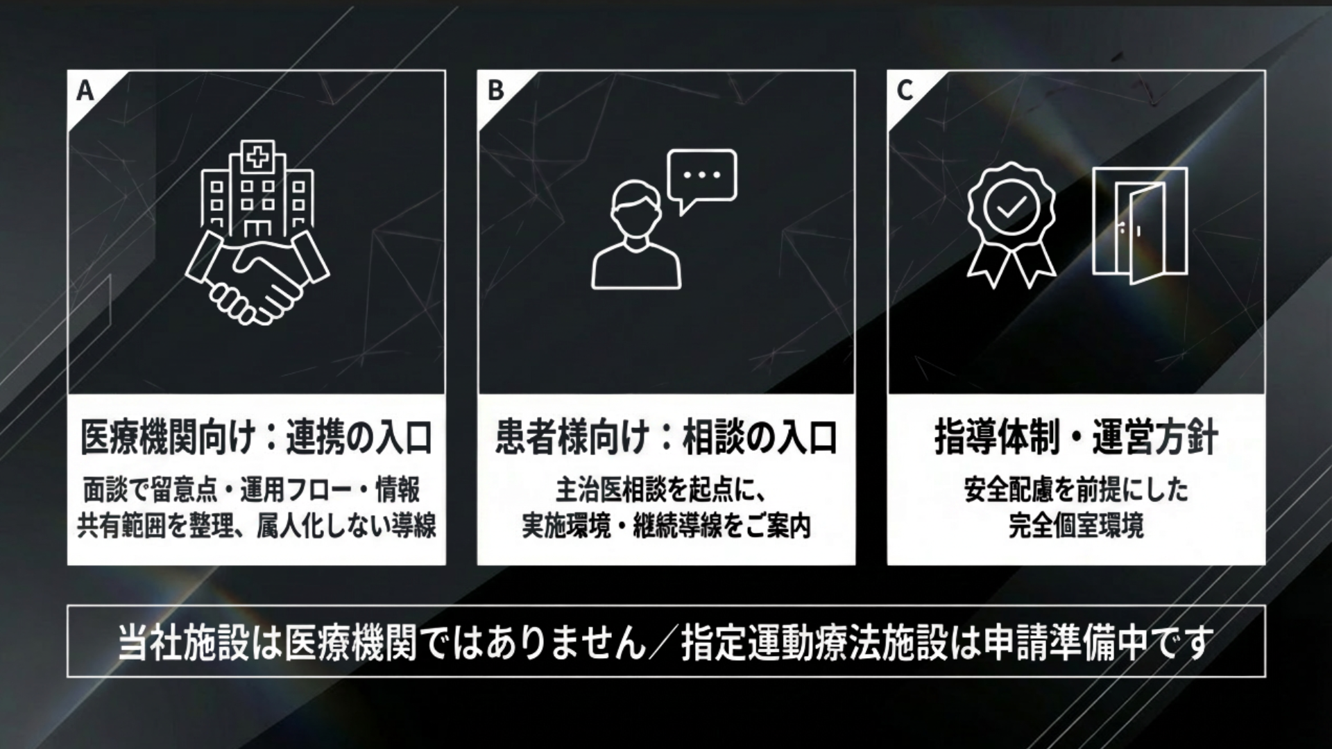 当社施設は医療機関ではありません。診断・治療・処方等の医療行為を提供するものではありません。運動療法に関する安全配慮は重視しますが、特定の治療効果や「治癒の早期化」等を保証するものではありません。指定運動療法施設は申請準備中であり、認定取得や制度上の適用を保証するものではありません。
