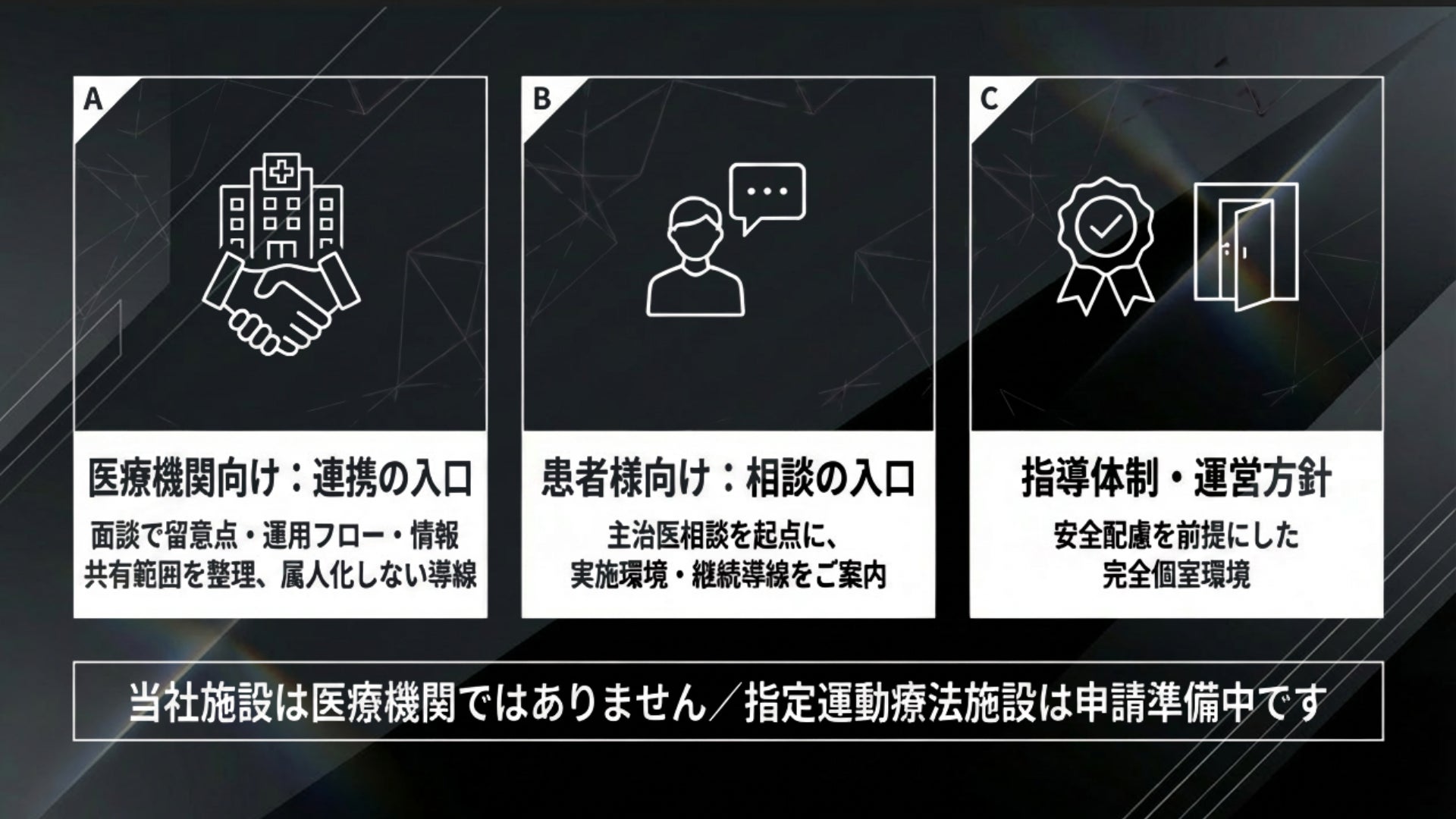 本取り組みは、運動療法が必要な方に適切な形で届くよう、医療機関と施設の連携導線を整備するものです。現時点では、指定運動療法施設は申請準備中であり、認定取得や制度上の取り扱いを保証するものではありません。