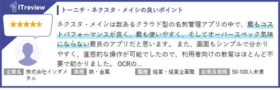東日印刷株式会社(本社:東京都江東区、社長:西川光昭、以下 TONICHI〈https://tonichi-printing.co.jp〉)のIT事業部門・T-NEXT本部が開発・販売する法人向け名刺管理アプリ「ネクスタ・メイシ」(https://tnexta.com/) が、アイティクラウド株式会社が運営する国内最大級のIT製品/SaaSのレビューサイト「ITreview」の「ITreview Grid Award 2025 Winter」の名刺管理ソフト部門において、顧客満足度の高いサービスに贈られる「High Performer」を受賞しました。